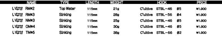 私が多用するのはNM3とOM4。どちらもほぼTOPのルアーと思っていい。ただ、下の表を見れば分かる通り、OM4は30グラムとかなり重い。