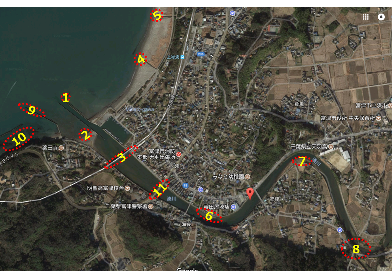 上記の中でも、特に有名なのは、1の「河口右岸導流堤先端」と、2の「河口左岸シャロー」、3の「内房線鉄橋下」、11の「内房なぎさライン橋下」の4つだ。
