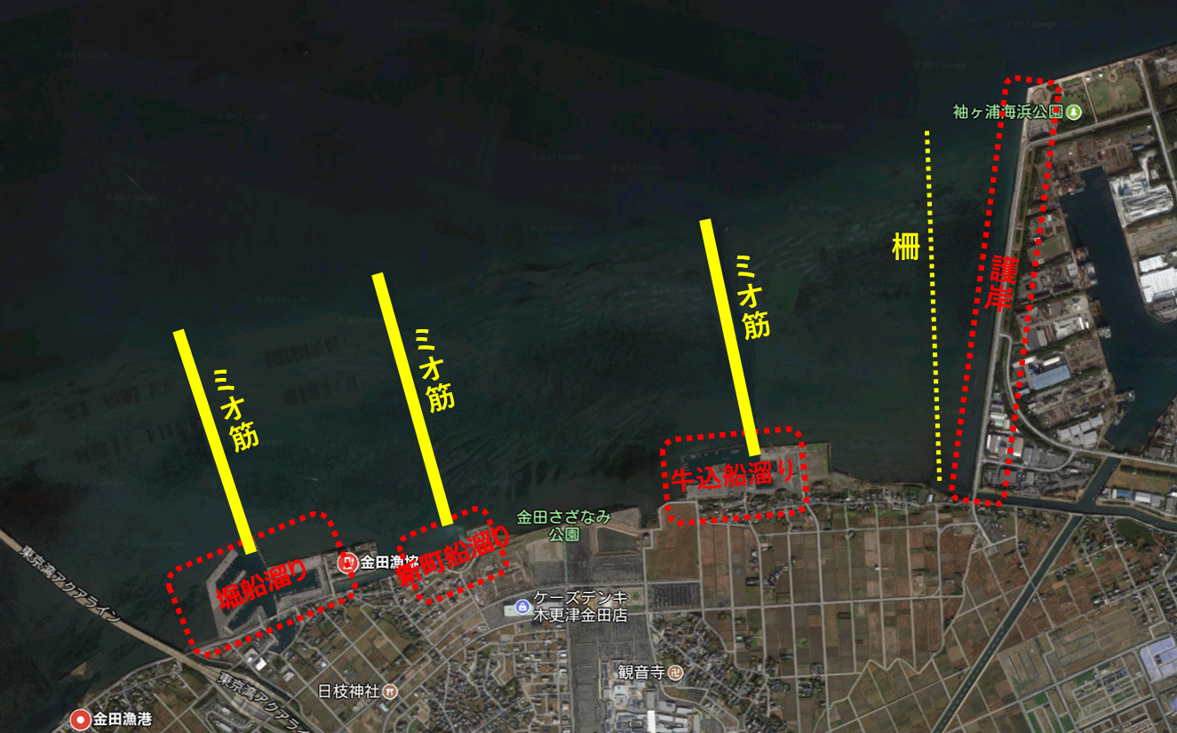 今回のポイントのすぐ近くの埋め立て地には「袖ケ浦海浜公園」があり、トイレも完備さてれおり、休日ともなると多くの家族連れが訪れる。また、この埋め立て地とアクアラインの間には「堀船溜り」「新町船溜り」「牛込船溜り」の3つの漁港が存在し、それぞれの港の出口の船道は、そのまま沖に伸び、いわゆる「干潟のミオ筋ポイント」を形成している。