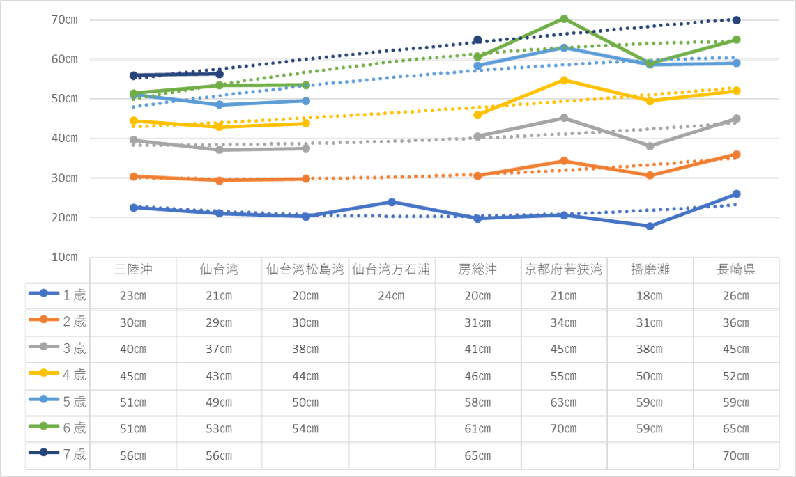 - 三陸沖:1 歳 22.6 ㎝,2 歳 30.4 ㎝,3 歳 39.6cm,4 歳 44.5cm,5 歳 51.1cm,6 歳 50.4cm,7 歳 56.0cm