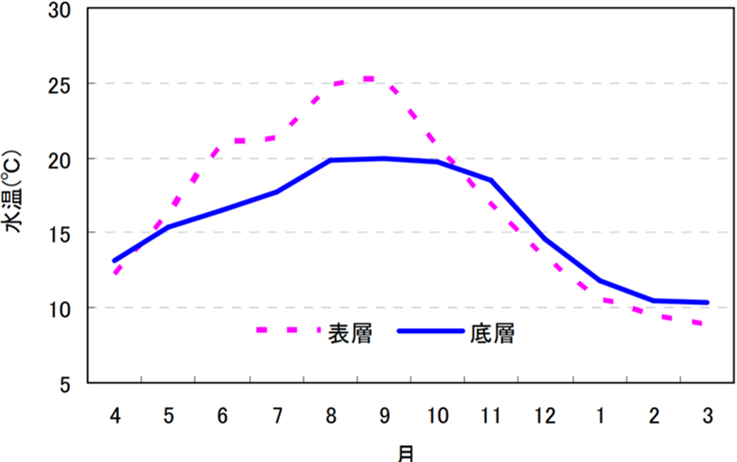 水温は夏期に表層が底層よりも5℃程度高いことから、夏期は成層構造がよく発達していることが示唆された。しかし、表層と底層の水温差は 10 月過ぎには逆転し、11 月以降は底層が表層より約1℃高くなった。冬期は表層に比べて底層が相対的に水温の高い外洋水12)の影響を強く受けているためと考えられる。