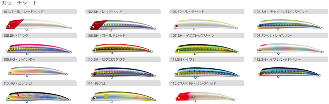 上記のタックルBOXには「SHレッドヘッド」と「HGレインボー」の2つのカラーのものが入っているが、他にも色々なカラーラインナップが用意されている。改めて、みてみると、どれもこれも欲しくなる・・・。