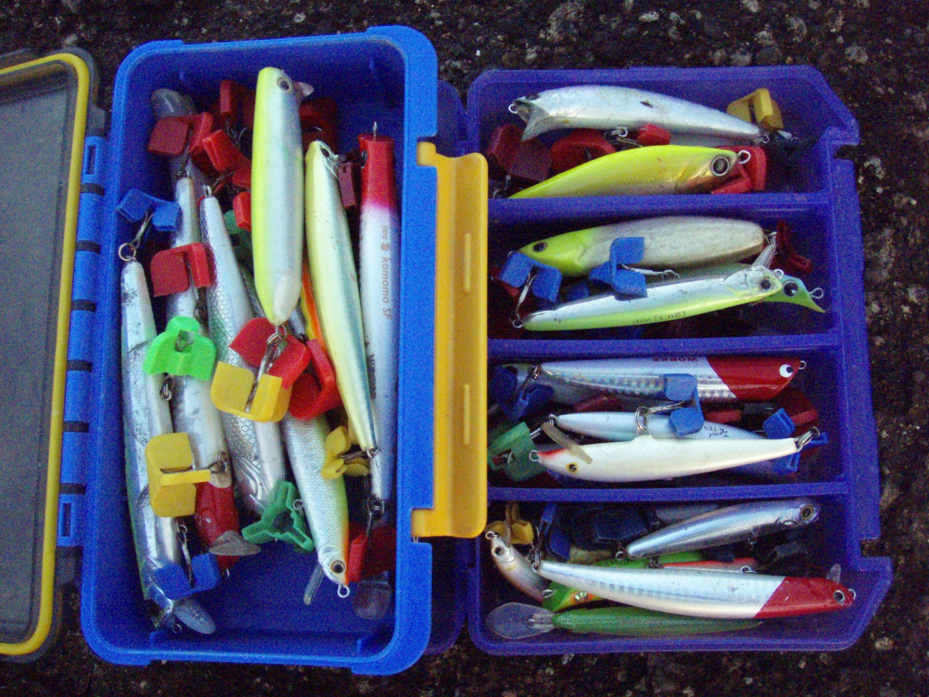 また、下記の写真は、ある日の私のタックルボックスの中身を写したものだ。私の場合、ウェーディングベストの左ポケットには、比較的大きなルアー用のBOXを入れ、右のポケットには小さめのルアー用のBOXを入れていることが多い。