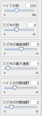 また、このシミュレーションでは、ベイトやスズキの数・視野の広さについても、自由に数値(パラメーター)を変えられるようにしておいた。