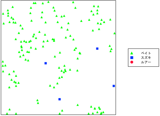 この手法の一般論については、上にご紹介した以前の記事をご参照頂く事にして、まずは今回のシミュレーションの登場人物である「ベイト」「スズキ」「ルアー」の動きについて、どんな規則でプログラムしたかを解説することにする。
