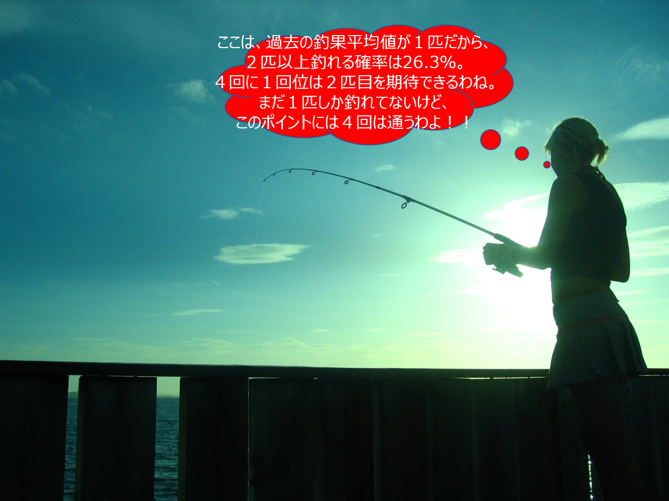 前回の記事では、統計確率の分野の定理・公式を駆使して「将来釣れる確率」の公式を編み出して、色々なケースの「将来釣れる確率」の具体的数値の算出にトライしたが、この「釣れる確率公式」について、強い影響を与える自然現象等が発生した場合は「使い方」に注意が必要になると注意書きした。次回は、その「使用上の注意」について解説することにしよう。