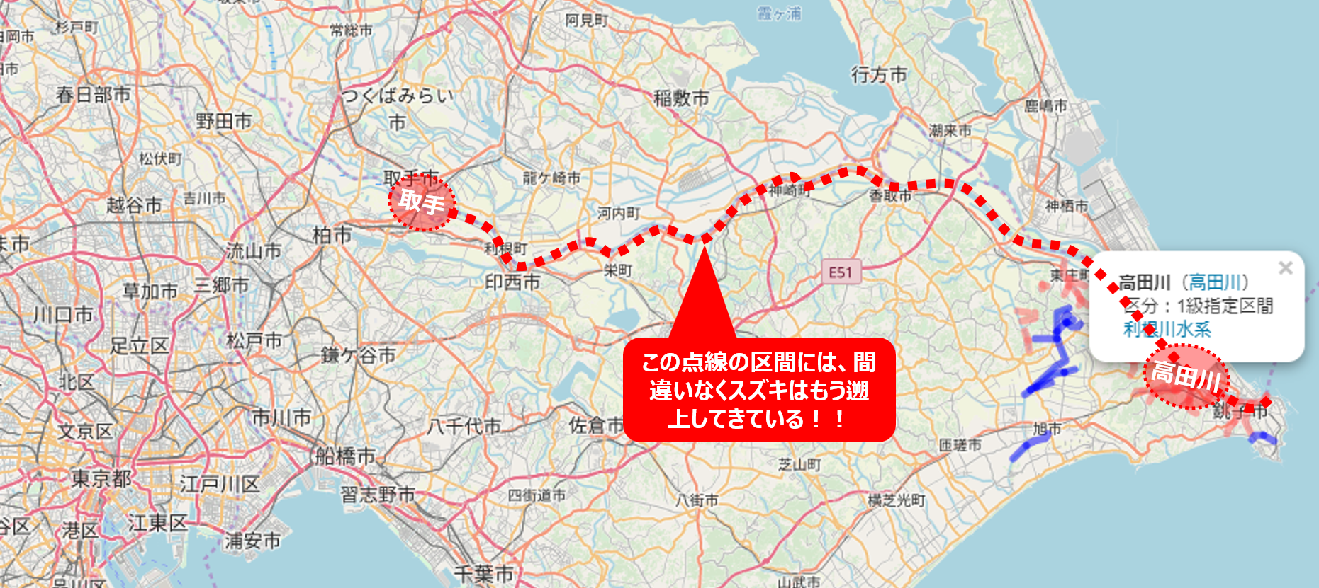 昨年は、私自身は残念ながらGWの期間中にはスズキをゲット出来なかったが、友人はゲットしている。私自身がGWの時期に利根川を攻める場合は、下の地図の赤点線の区間の「高田川合流部~取手」の区間をうろうろすることが多い。