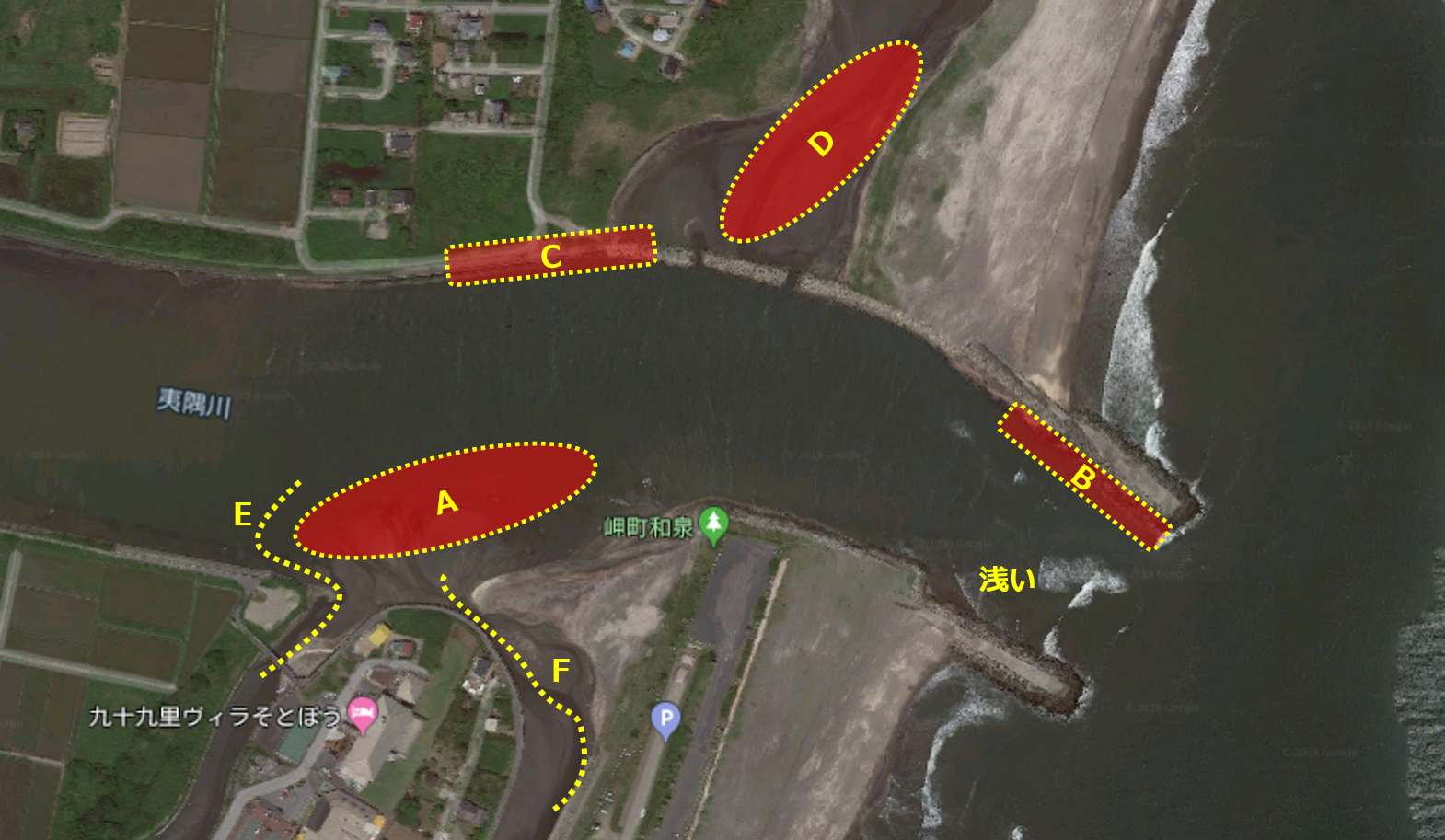 下の画像に記したA~Fが、夷隅川河口におけるスズキの実績ポイントだ。以下、それぞれのポイントについて解説する。