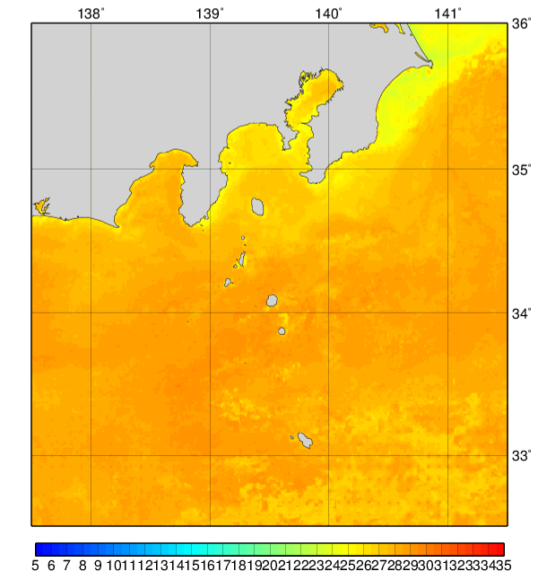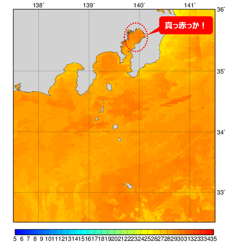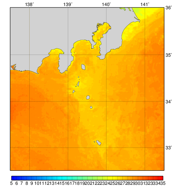 上にご紹介した昨年の記事では、日本近海の海水温は異常な高水温になっていると書いたが、今年はどうなのだろうか?とりあえず、衛星観測データから作成した、関東近海エリアの表面水温分布水温図を見てみよう。