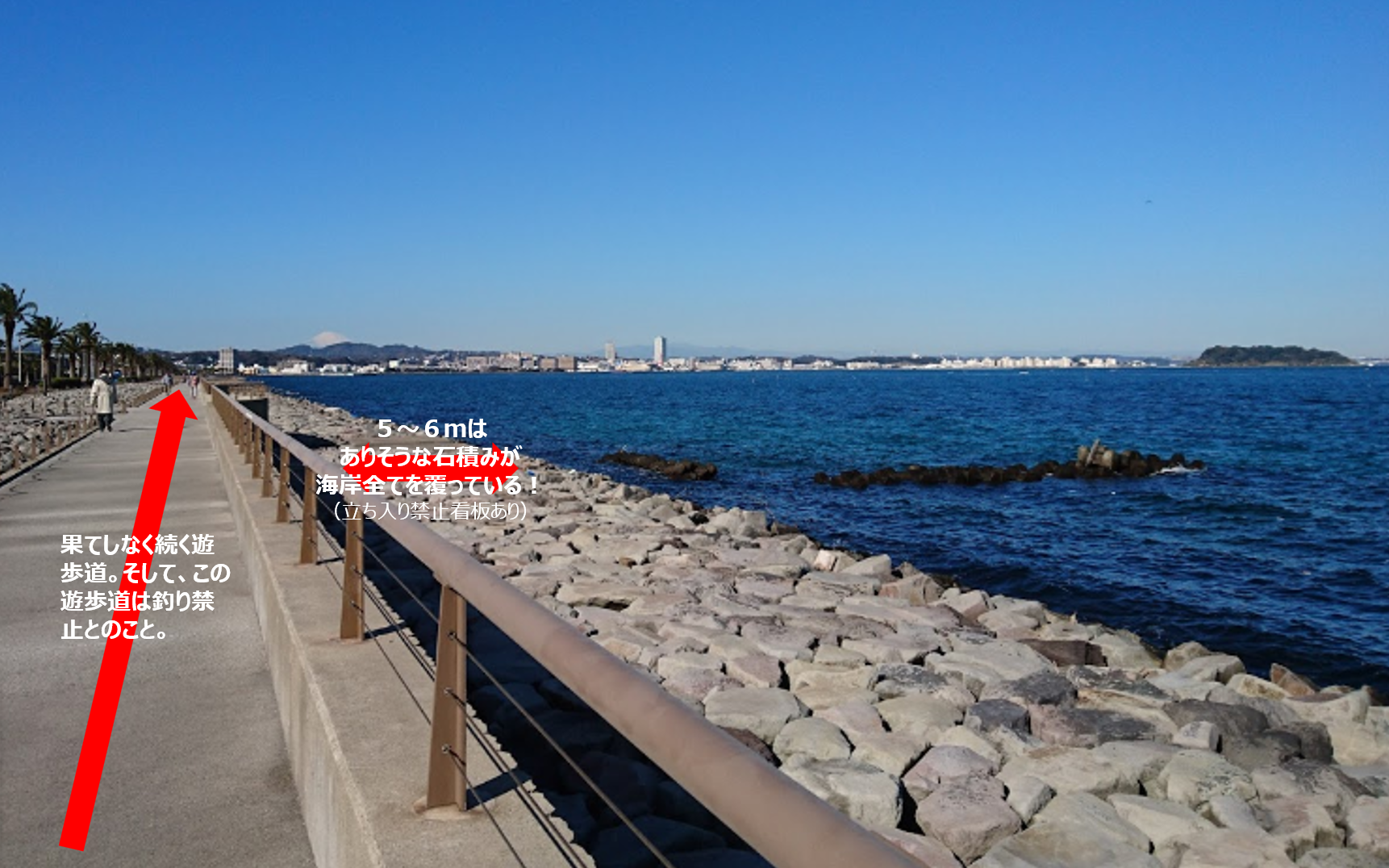 以前も、海岸線には高い岸壁がある部分もあったが、岸壁から釣りをして居る人間はよくいたし、所々海岸の砂浜に降りて釣りをすることが出来る場所があったのだが、今や馬堀海岸は「全面釣り禁止」となっていると考えていいだろう。