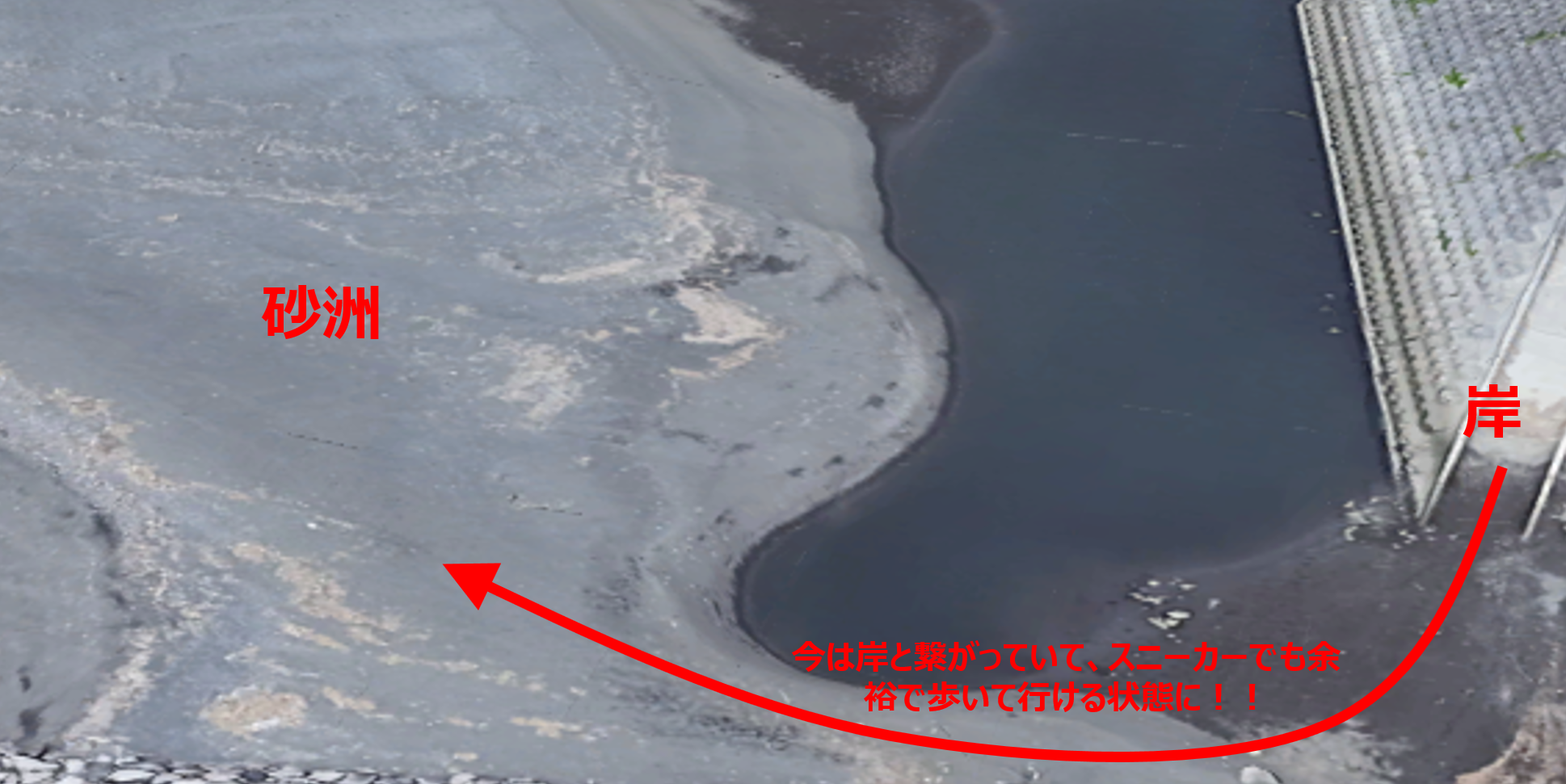 その画像では、下の画像のように砂洲が岸と繋がっているではないか!!思わず「聞いてねぇ~よぉ~」と呟いてしまった。このホームページの愛読者の方々は既にご存じとは思うが、私は、普段釣り友達とポイント情報を、ほとんど交換することが無いので、そういう「聞いてない系」の話はよくあるのだ。