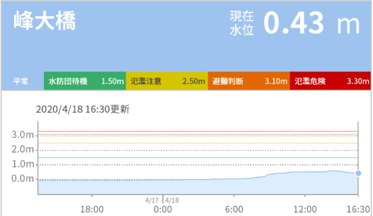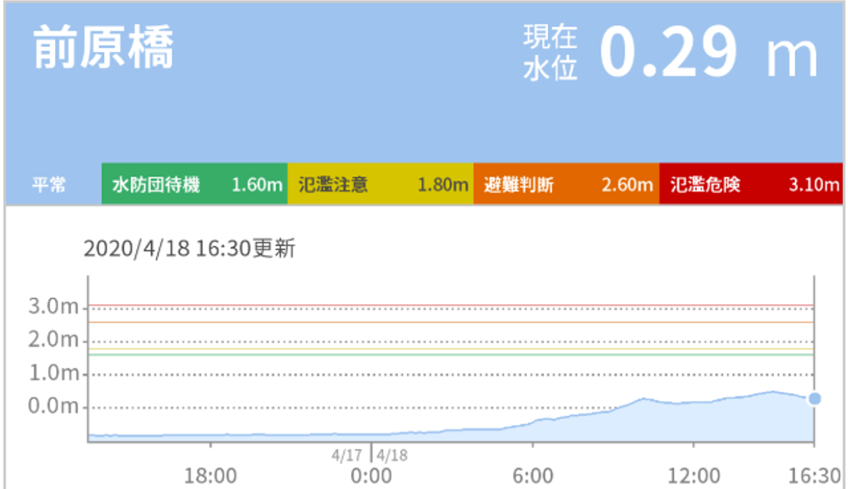 夜間になってしまい、カメラ映像がよく見えない方は、河川の増水状況を確認してみるのも手だ。最近は、災害対策用に、河川の増水状況については、WEB上に、いろいろなリアルタイムデータが提供されているので、ご興味のある方は、下の記事もご参考にどうぞ。