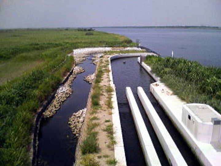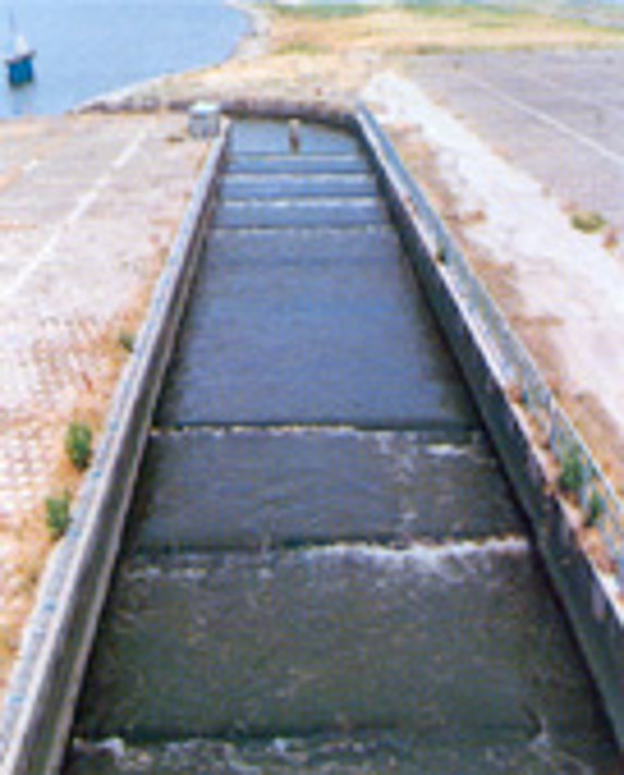 《利根川河口堰右岸側の魚道 ※左側には多自然魚道も併設されている》