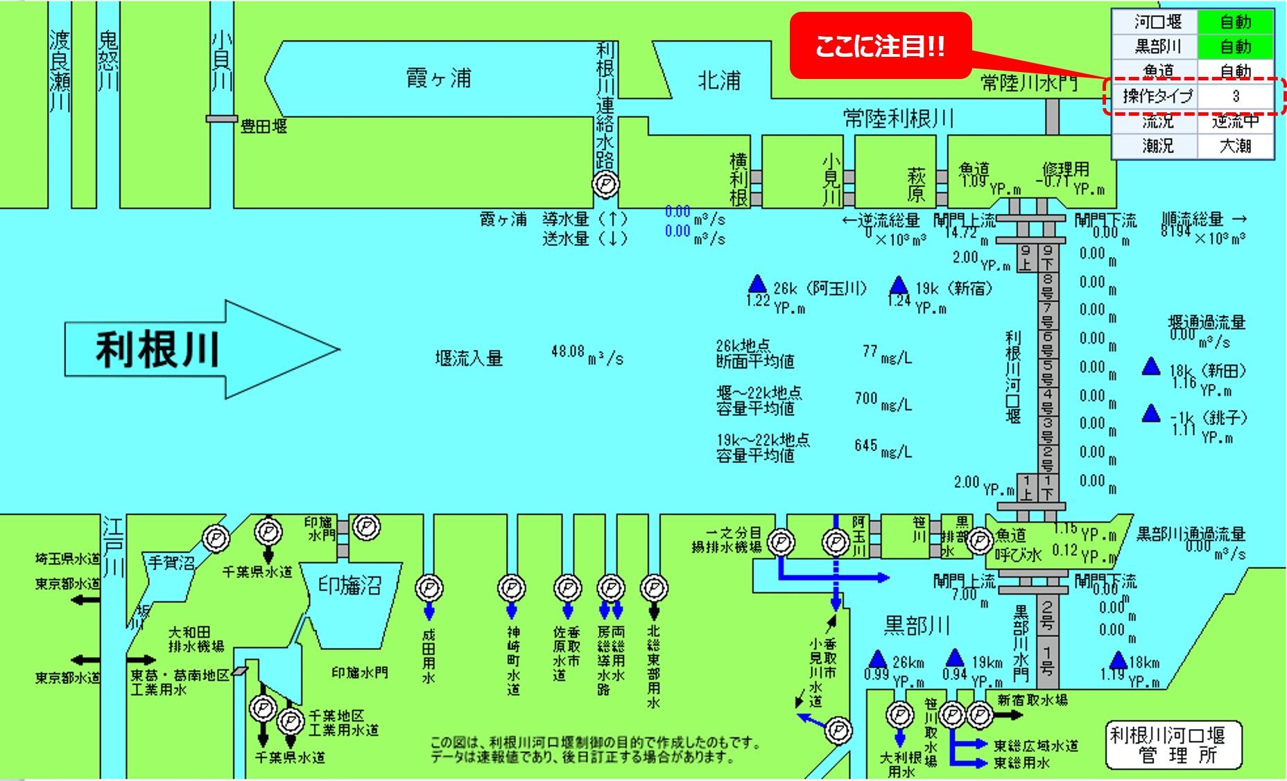 なんだかよく分からない画像だが、実は上の画像の赤点線で囲った「操作タイプ3」という表示が堰の開閉状況を示している。それを理解するには、まずは利根川河口堰のメカニズムを理解する必要があるので、今回はそれについて詳しく解説しよう。それにしても、なんでお役所というのは、こういう分かりにくい情報公開をするのだろう。何か意図があるのだろうか・・・