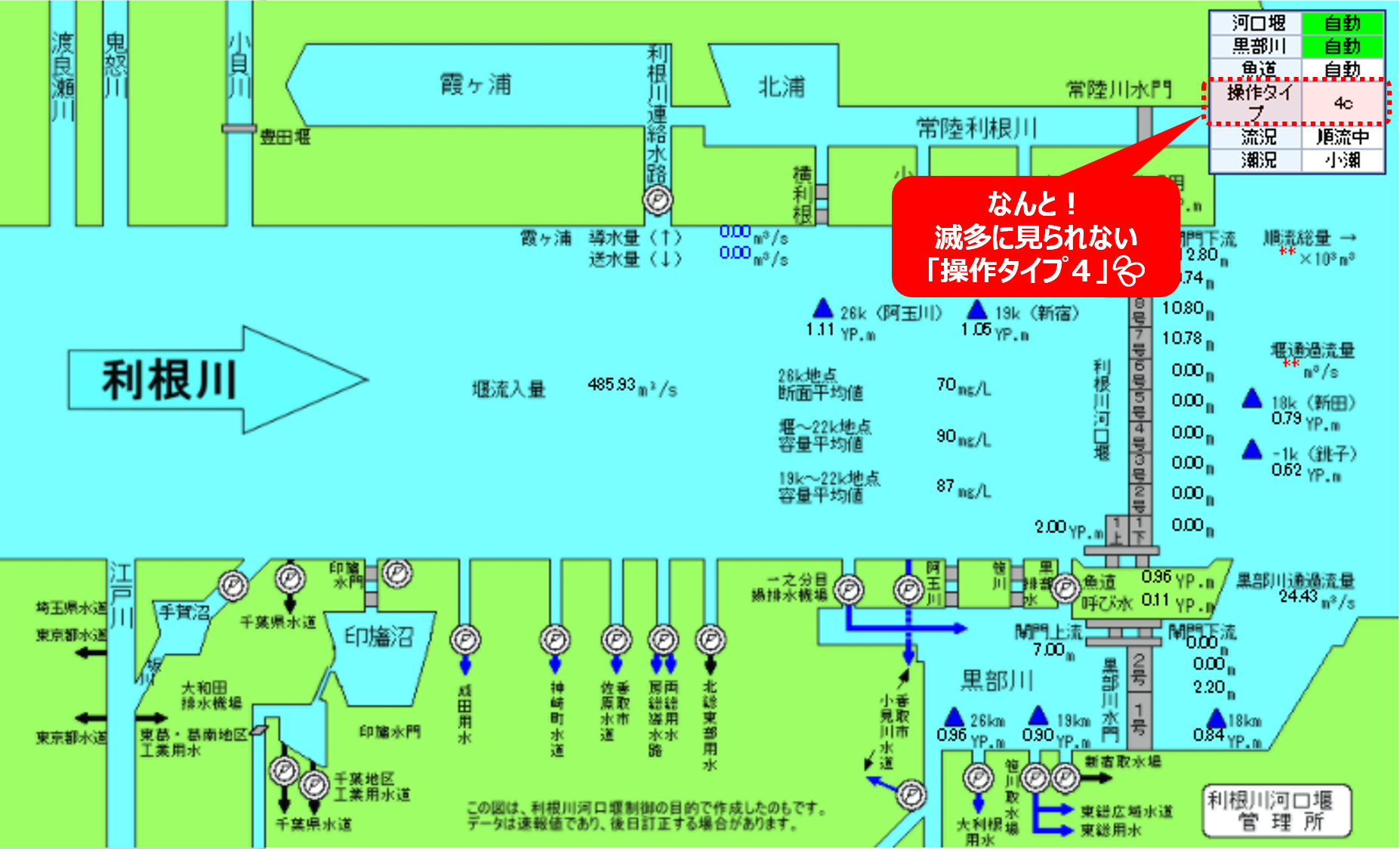 台風10号対策か、利根川河口堰が、滅多に見られない「操作タイプ4」になっています。