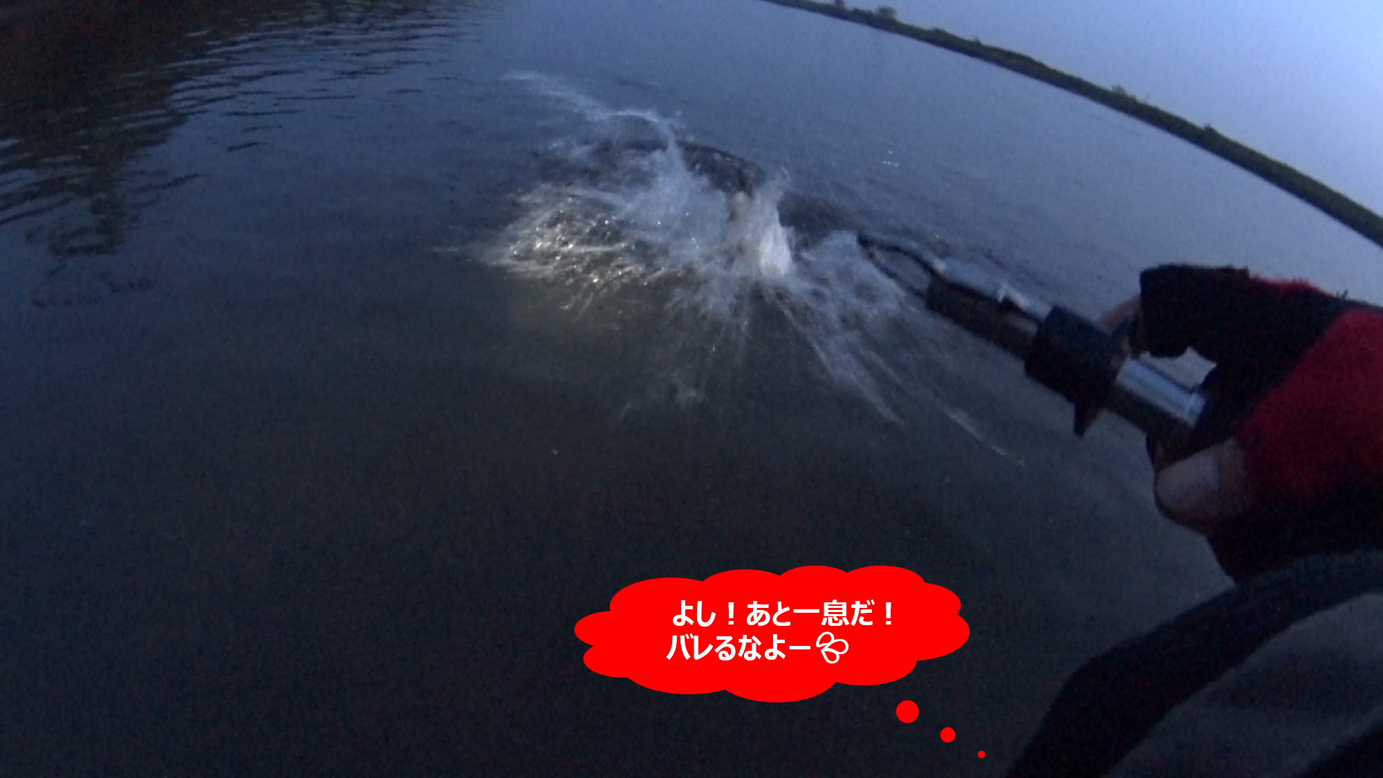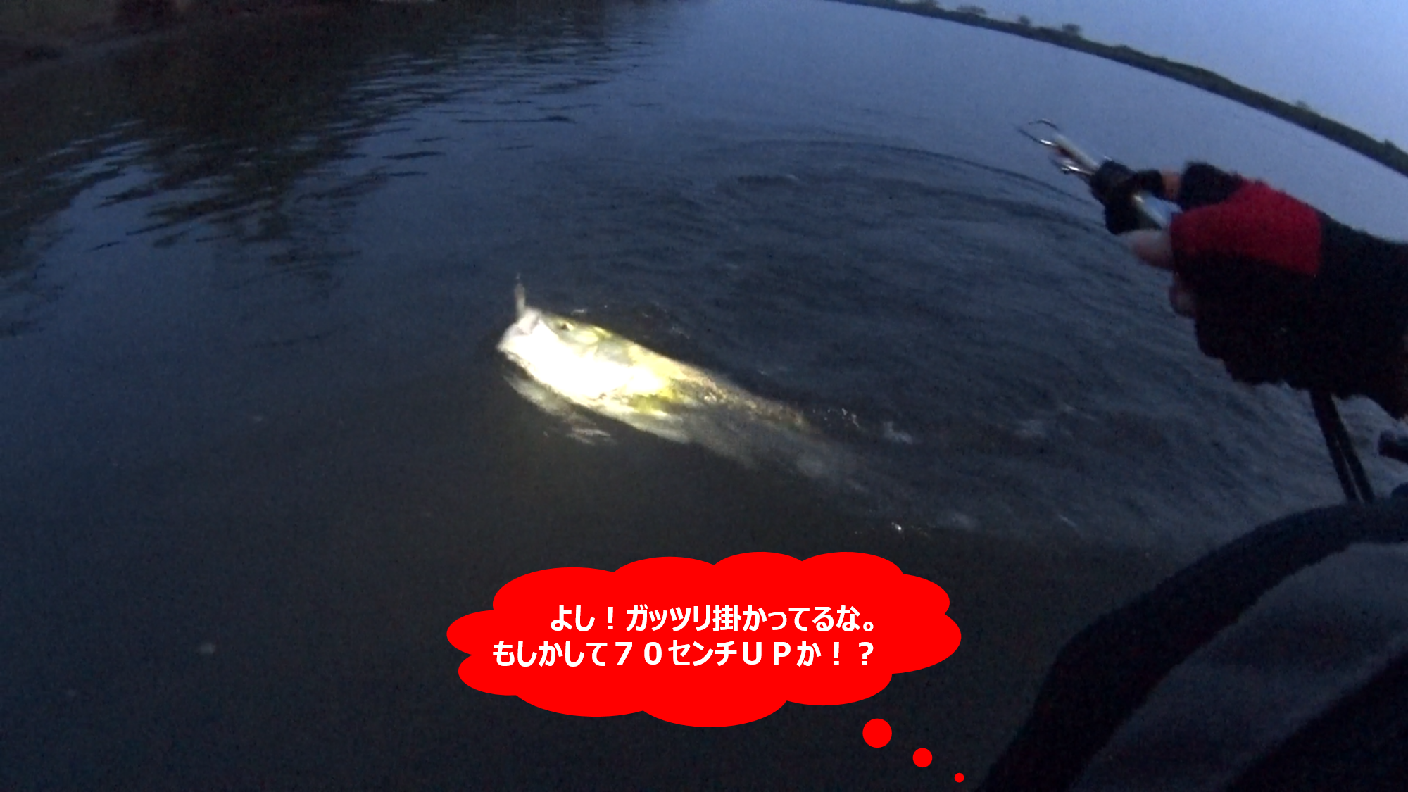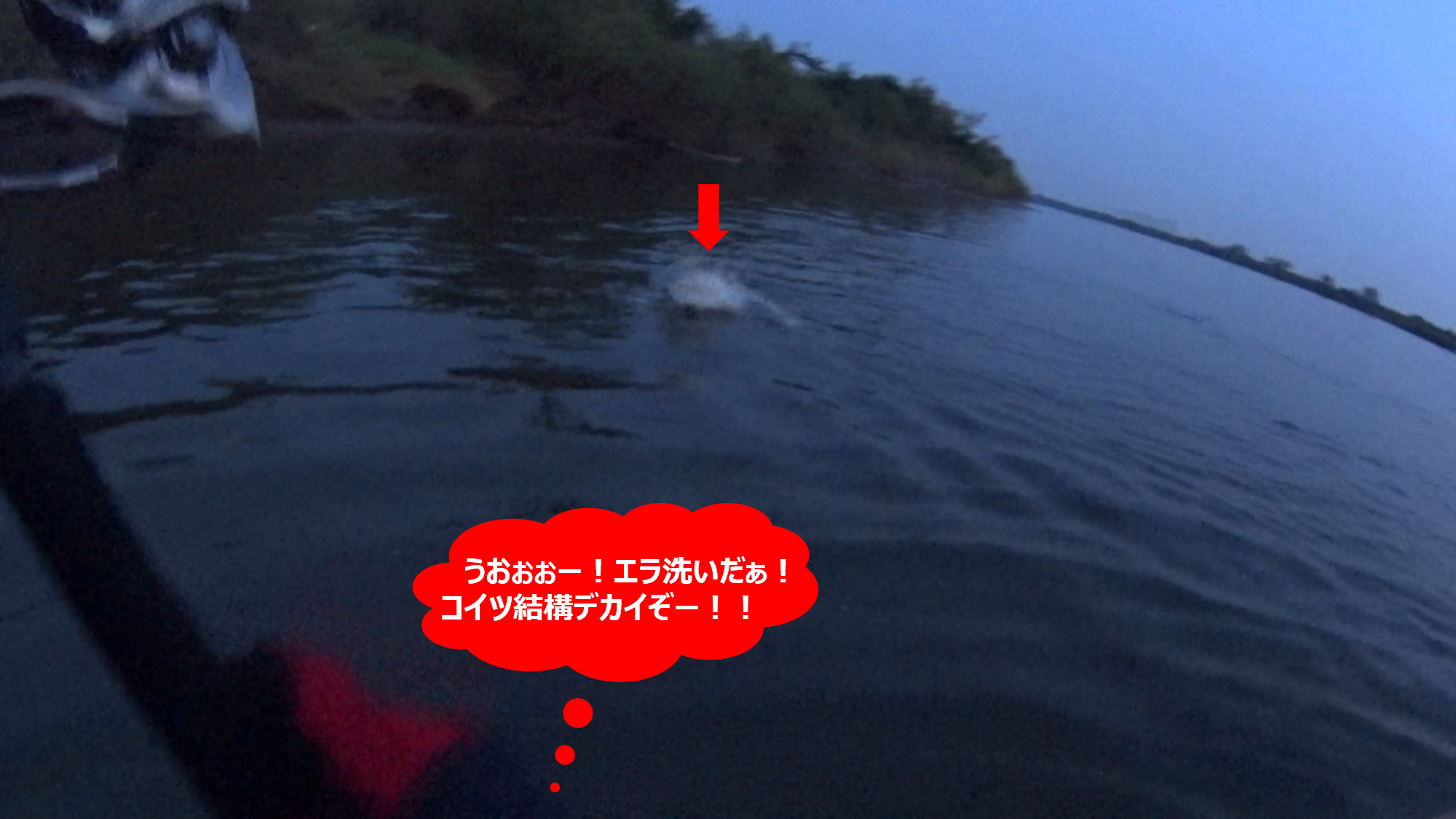 ちなみに、下の画像は当日の実釣動画からのキャプチャー画像なのだが、この水面のザワツキが利根川での爆釣ポイント開拓の重要ポイントの1つになるのだ。