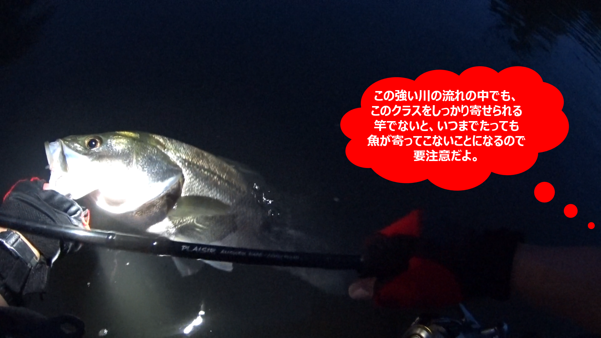 上の画像にも記してあるが、このポイントはかなり流れが強く、場所によっては足を取られて流されそうになるくらいなので、そんな場所でまともなサイズのスズキが掛かったら、相当しっかりした竿でないと、魚を全く寄せられず、永遠にドラグを出されて終わりになる。