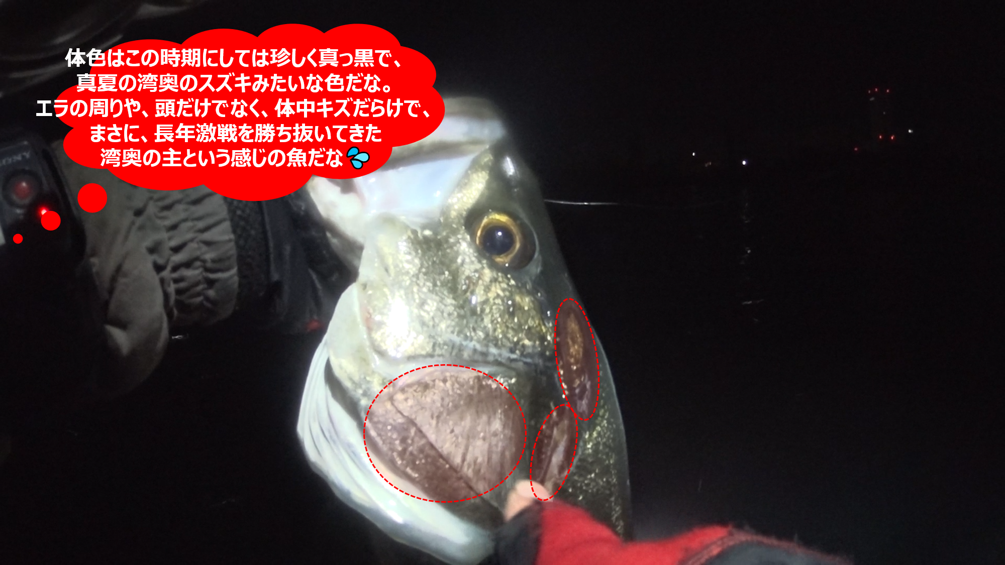 8.写真では分かりずらいが、体色はかなり真っ黒だった。しかも、体中キズだらけで、まさに激戦を潜り抜けてきた湾奥の主(ぬし)という感じの個体だった。