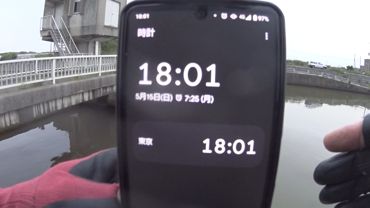 何故「堰が閉じてても、結構釣れちゃったりするんじゃないか?」と思ったのかというと「堰が閉まっていても、ここは河口からすぐの場所なので、ガァーっと潮が上げてくるような日・タイミングなら、それなりに流れが発生するのではないか?ベイトの数も、堰が開いているときに比べると確かに少ないが、ベイトが全く居ない訳ではなく、ポツポツ居るし、水中には多くのストラクチャーや凹凸があるので、居付きのシーバスも結構居るのでは?それなら、夕マヅメと潮が動くタイミングが重なるこのタイミングなら、入れ食い爆釣は無くとも、2、3匹位はポンポンと釣れちゃう可能性もあるのでは無かろうか・・・。2、3匹釣れれば、単独釣行の釣果としては十分だ!」と思った訳である。