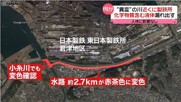 汚染物質の流出の範囲は下図の範囲とのことで、汚染物質は明らかに「小糸川」に流れ込んでいる。上下の画像は、いずれも「日テレNEWS24」からのものだ。