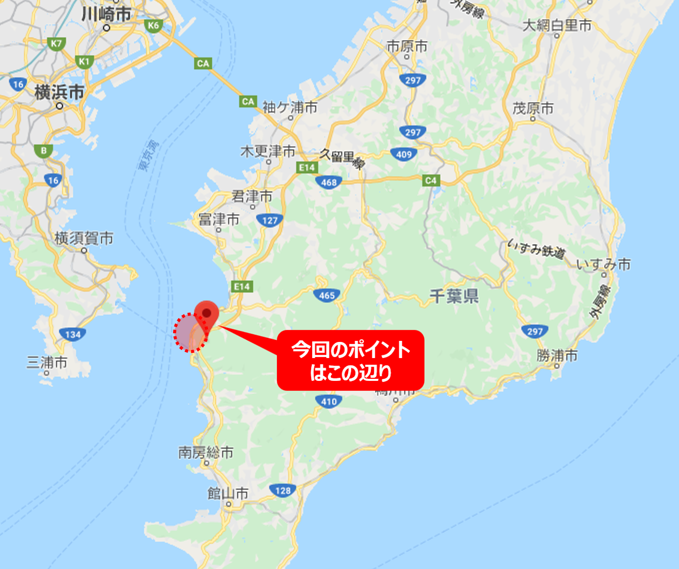 今回Bigシーバスをゲットしたポイントは、千葉県内房エリア(南房と言った方がいいか?)の地磯だ。目の前に東京湾の出口である浦賀水道があるエリアで、潮通しは極めて良いエリア。