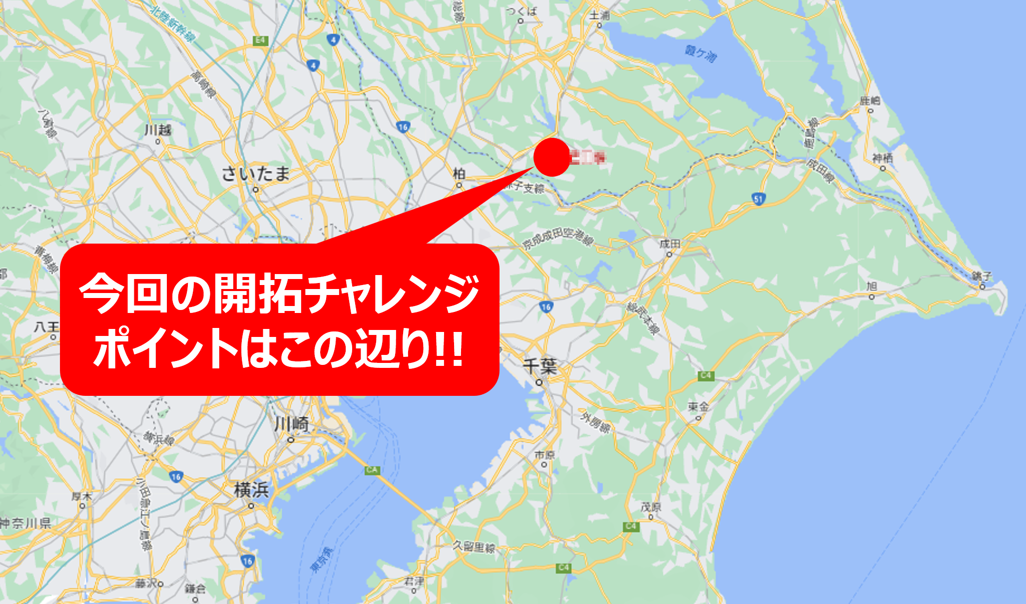 今回はズバリ、利根川方面に新規ポイント開拓にチャレンジして来た。ただ、利根川については、毎年夏の時期になると、このホームページでも開拓に訪れており、読者の皆さんに「また利根川か・・・」と言われるのも申し訳ないし、利根川でシーバスが釣れるのは、もう皆さんもご承知だと思うので、今回は少し志向を変えて、下の地図画像に示したとおり、微妙に利根川から赤丸がズレている場所を開拓して来た。
