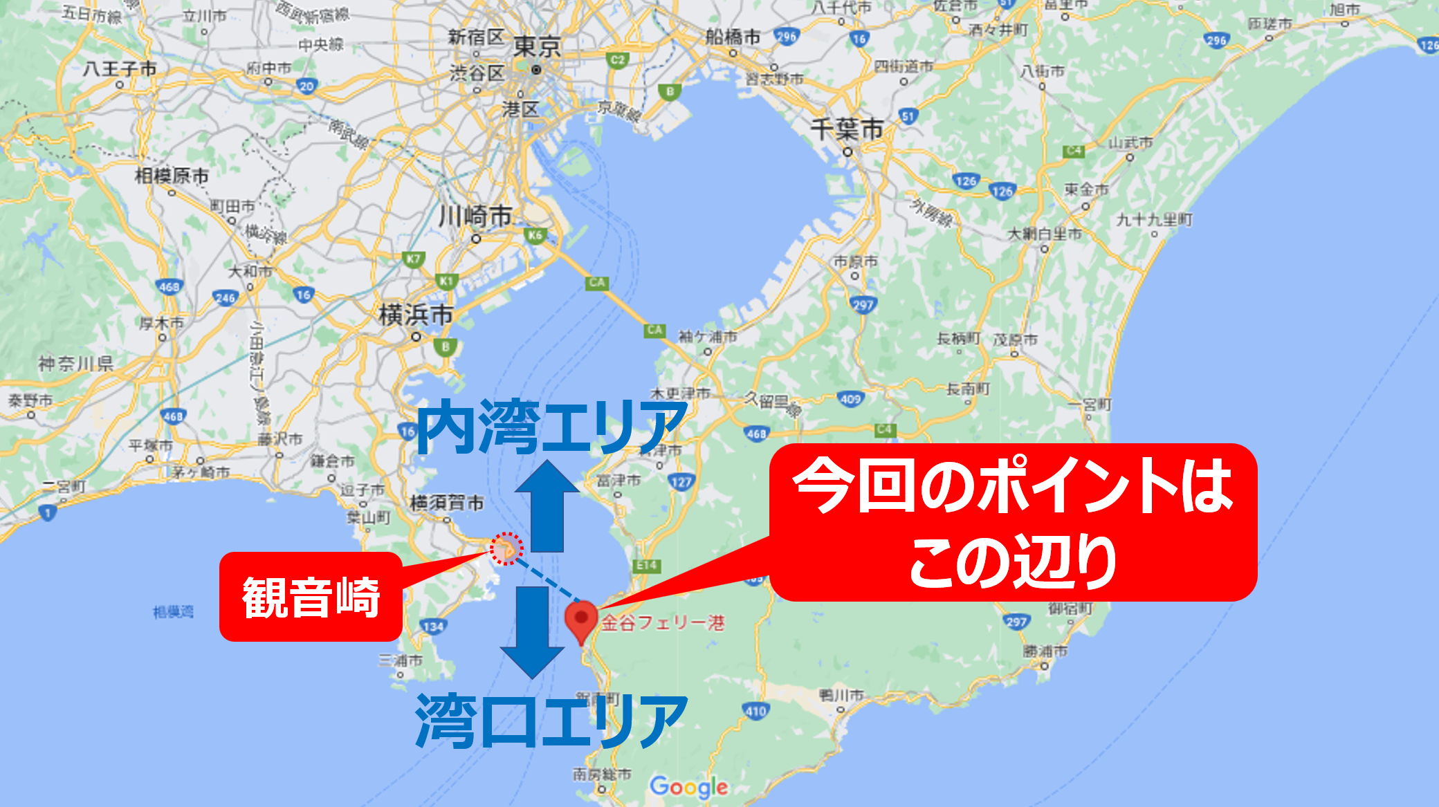 今回訪れた地磯は、千葉と神奈川を結ぶカーフェリーの港である「東京湾フェリー金谷港」と、シーバスフィッシングのメッカである「湊川」がすぐ近くにある、地磯が続くエリアで、目の前には「浦賀水道」がある。