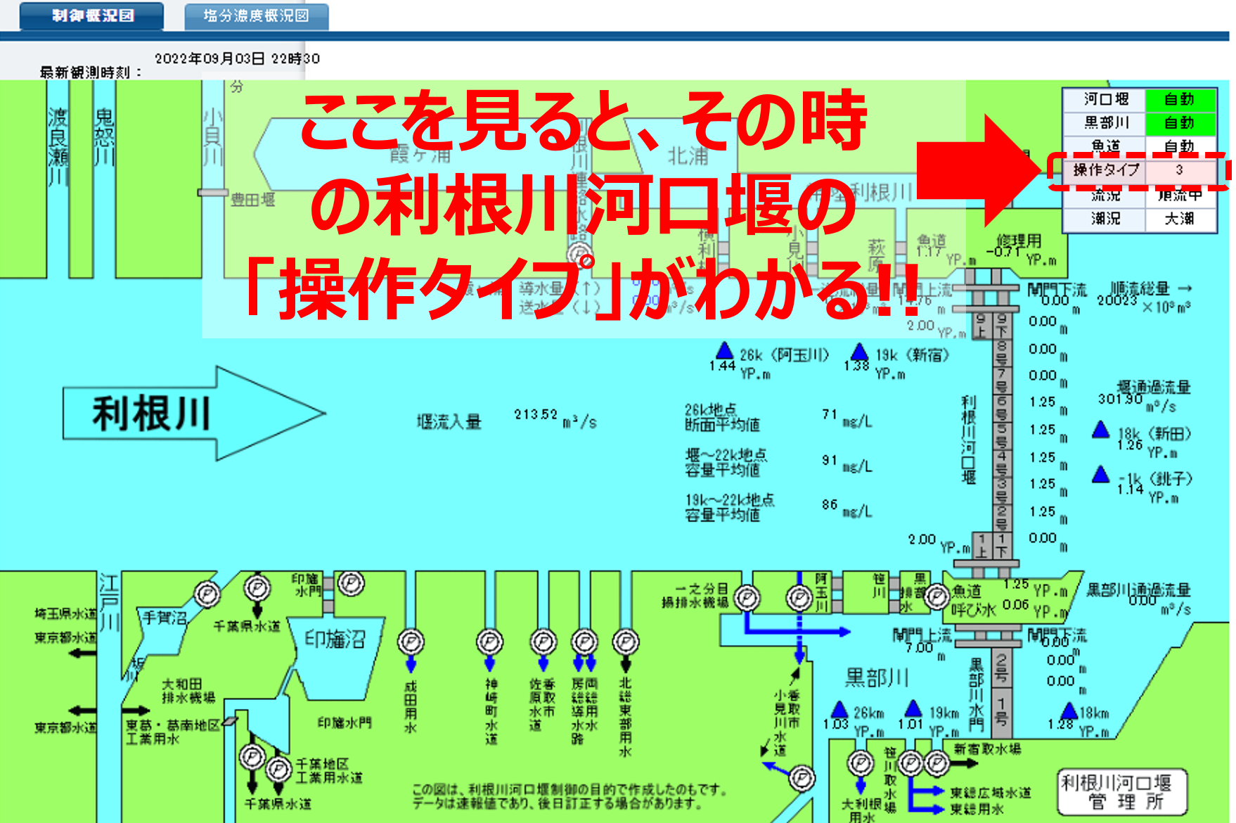 下の画像は、上のリンク先にある、堰の開閉状況を示す画像の「2022年9月3日 22時30分時点」のものだが、ぱっとこれを見ても、さっぱり意味が分からないと思うので、下の図の赤点線の部分を見ると、その時の利根川河口堰の「操作タイプ」が記されている。