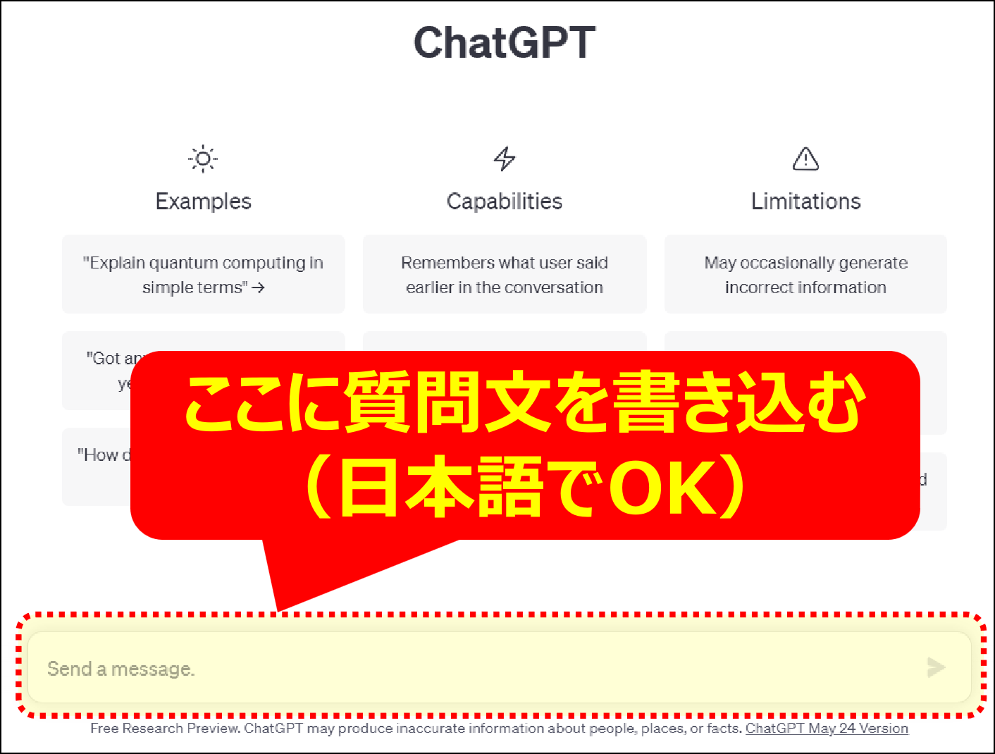 6.インタラクティブな会話を体験するには、テキストボックスやチャットボックスを見つけます。通常、それに入力して送信ボタンをクリックすることで、ChatGPTとの対話が始まります。