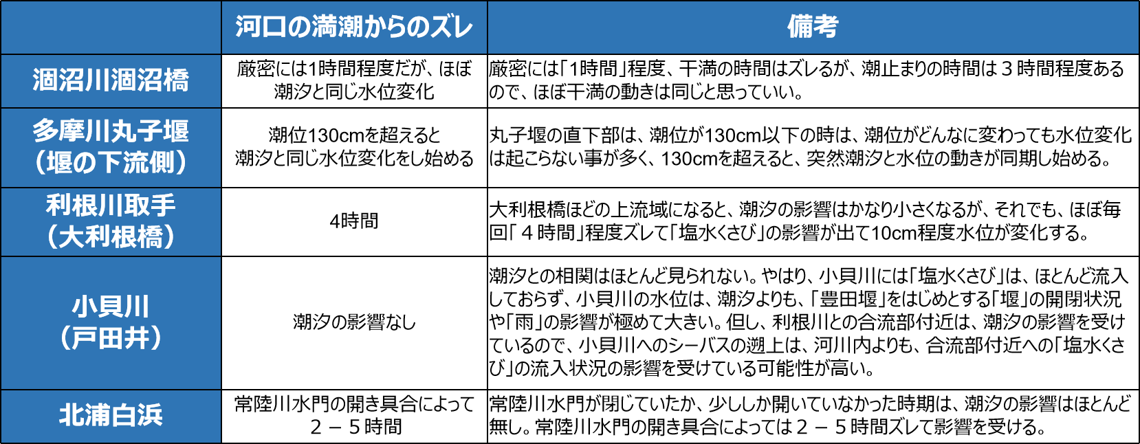 とはいえ、やはり「潮汐の影響がある流域」では、下流域に近づくほど、海と河川内を行き来しているシーバスの比率が増え、海から川に入ってくるシーバスの多くは「塩水くさび」の中を通って遡上してきていることが、多くの事例で確認されているので、「潮汐の影響がある流域」では「塩水くさび」がいつ自分の目の前に到達して来るのかを知る事が重要となる。