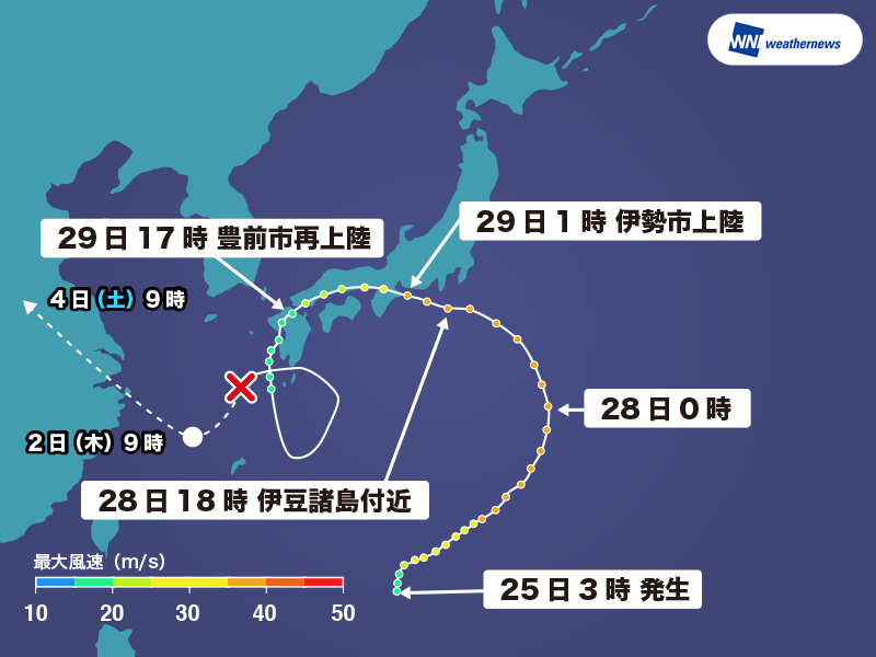 一方、今来ているの台風7号は、上とは全く異なる進路で、南から北に上がってくる進路で、このパターンは、上の台風12号程ではないが、まぁまぁ珍しい。