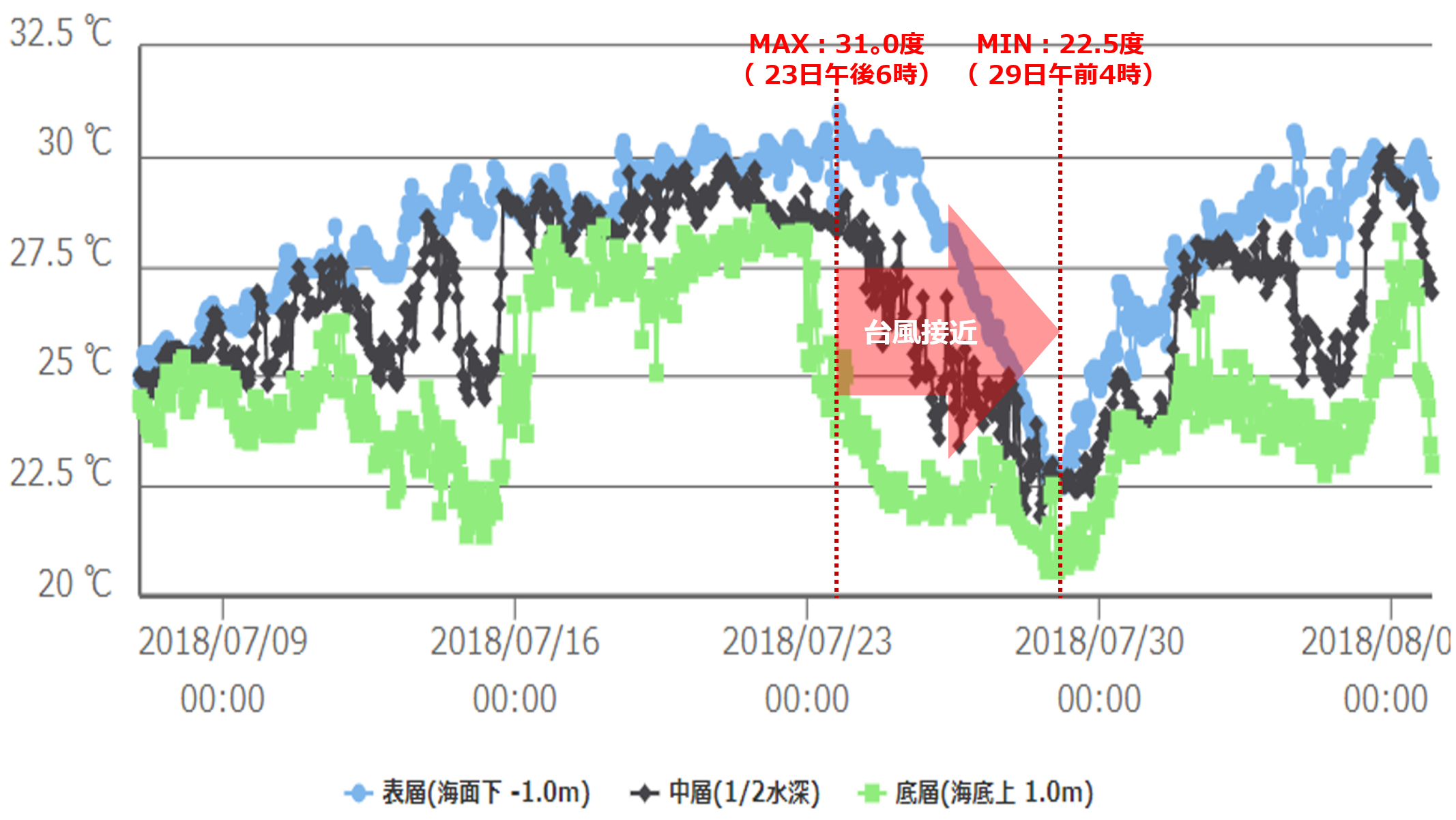下のグラフは、上記の記事に掲載したもので、千葉港の南西約5kmに設置されている「東京湾千葉灯標」にあるモニタリングポストで観測された、2018年7月に来た台風12号接近時のデータなのだが、台風の接近に伴い、上層でも下層でも、水温が急低下している事が見て取れる。