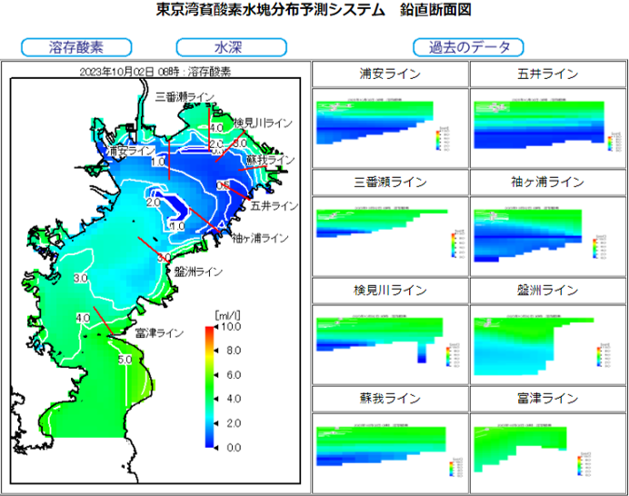 ちなみに、今日の最新状況は下のボタンをクリックすれば見られる。 最新の東京湾貧酸素水塊分布予測はコチラ また、水面付近はまだ空気に触れて、酸素が海水に溶けて供給されるので酸素濃度が高いのだが、下層に行くほど、酸素の供給は少なくなるので、酸素不足になり易くなる。 ちなみに、10/2の貧酸素水の鉛直分布は下の様になっていて、明らかに低層に貧酸素水が溜まって居る事が見て取れる。 この状況をみると、気温が下がって上層の温度が下がり、広大なエリアの低層に溜まっている貧酸素水が水面に上昇してきたら、間違いなく「青潮」が大発生するだろう。これは要注意だ💦