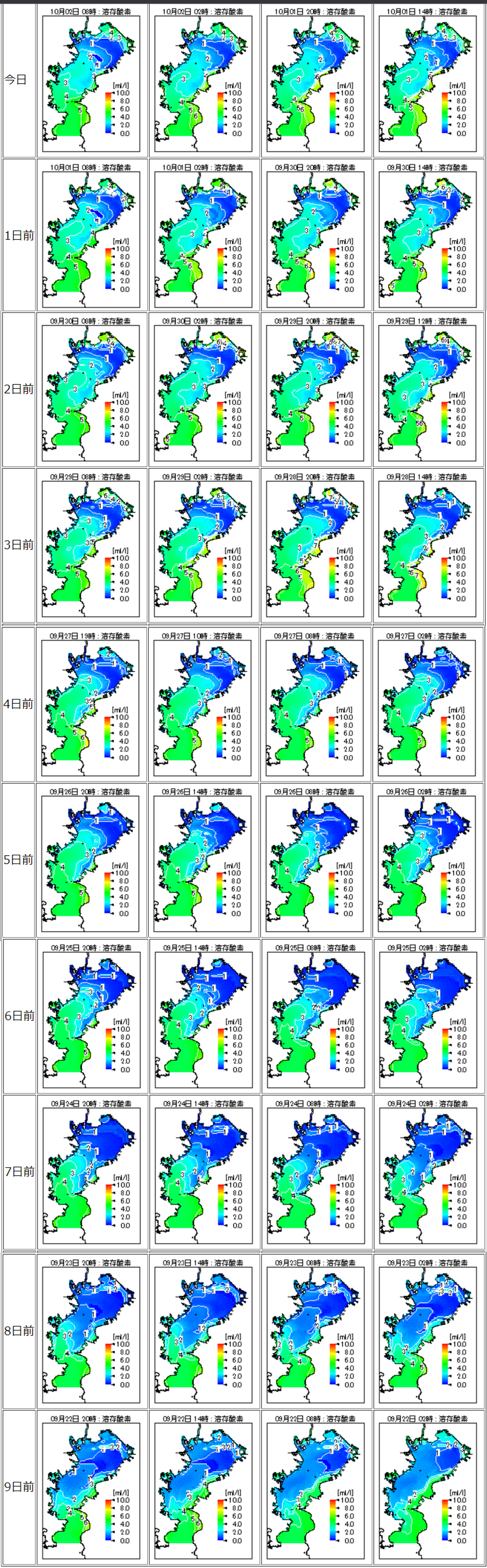 ここのところ、急に涼しくなってきて秋の気配が濃厚になって来たが、私としては今年の「秋」はおとといから来たと思っている。 中層以下の水中の水温は、地上の季節と1か月ズレて進んで行くことが知られているのだが、私の経験では、シーバスフィッシングのシーズナリティは、地上の季節感とかなり近い動きをしていると思っている。 ということで、今は産卵前乗っ込み爆釣の秋パターンへの移行期という微妙な時期なのだが、この時期、内湾部で気になるのは「青潮」だ。 今年も夏は異様に暑い日が多く、各地で大量の赤潮が発生し、水面付近には大量のプランクトンが発生していたので、これらが死んで水底に溜まって、バクテリアに分解される時に、大量の酸素が消費され、硫黄分が発生するので、水底付近は酸素が少なくて硫黄臭い、生物にとっては「死の水」が滞留することになる。 そして、秋になって水面付近の温度が下がってくると、温度の低い上層の水は下に落ちて行き、底付近に対まっている温かくて硫黄臭い貧酸素水が水面に上昇してくる。 そして、その上昇して来た貧酸素水に含まれる硫黄分が、水面上の酸素と化学反応をすると、青色に変色して、いわゆる「青潮」となる。 東京湾では「農林水産部水産総合研究センター東京湾漁業研究所」が「貧酸素水塊分布予測システム」で、東京湾の貧酸素水の分布状況を推定して、6時間おきに分布状況をネット上で発表してくれている。 ということで「9/23~10/2」の貧酸素水の状況をみてみると、下記のような感じで、東京湾の内湾部のかなり広いエリアが青色(貧酸素水)エリアになってしまっている。 9/26以降は、湾奥沿岸部に「緑色」の酸素濃度が濃いエリアが復活してきているのだが、9/27以前は湾奥の岸近くまでベッタリと、貧酸素水エリアが入り込んで来てしまっていた事が分かる。 ここまで、湾内の広い範囲に貧酸素水が広がってしまうのは、近年稀に見る現象と言っていいのではなかろうか💦