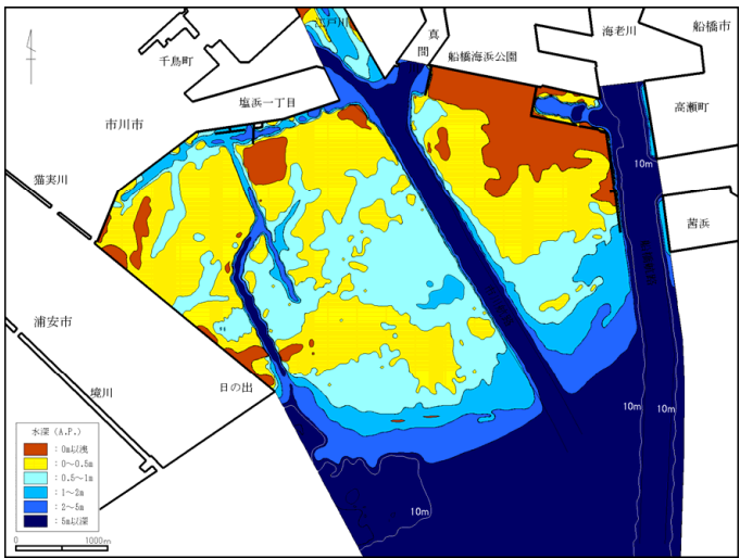 下記の、千葉県が公開している「千葉県三番瀬再生計画(事業計画)_070219」によると、この辺りは沖に伸びるミオ筋の根元近くに位置していて、深い筋が岸と平行に伸びている場所なので、高潮位時には沖からシーバスが入って来ることは十分に期待できる。