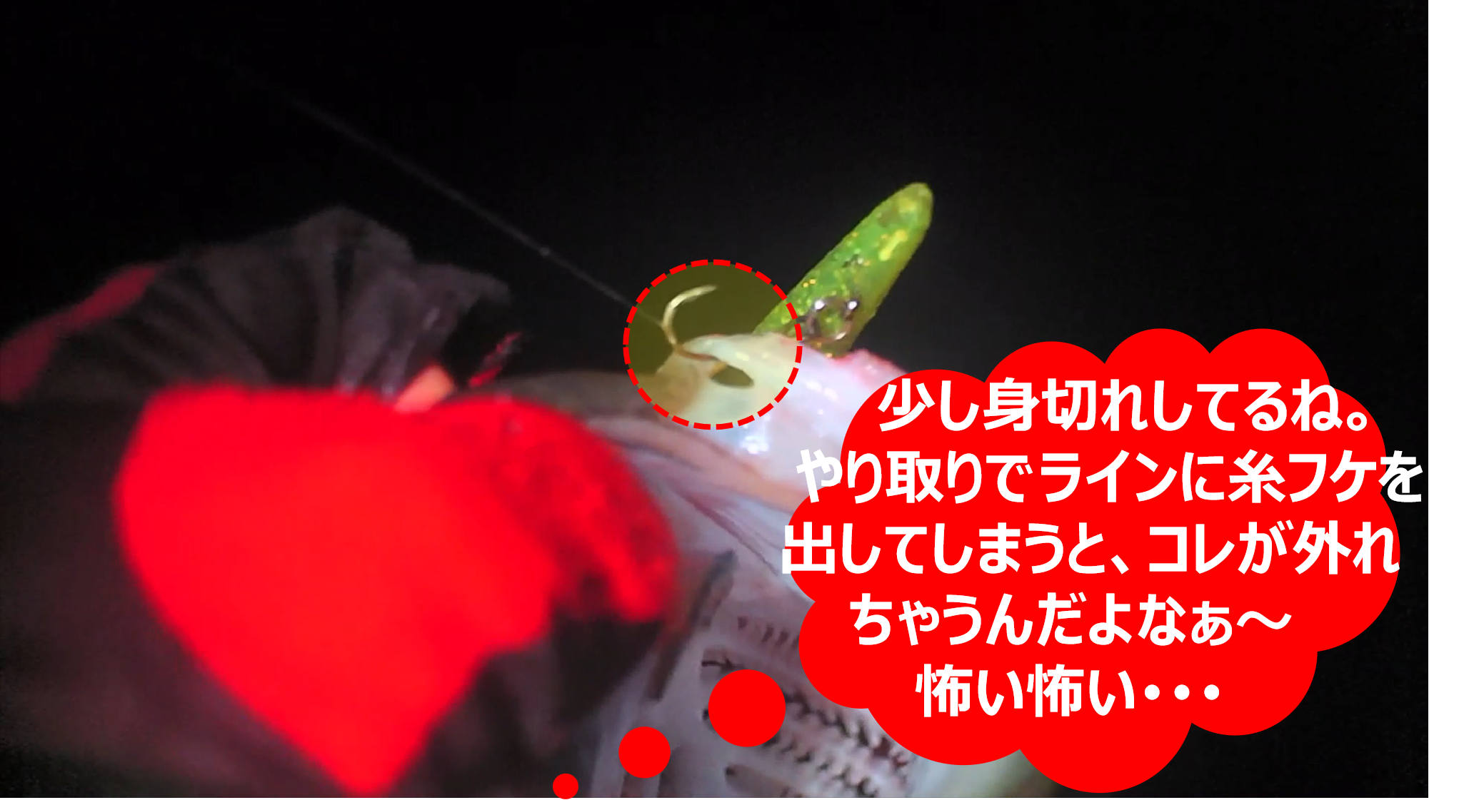 こういう状態の時に、ドラグを締め過ぎていると、裂け目が広がりバラシ確率が大きくなるし、やり取りの最中で、魚が首を振った時に糸フケを出してしまったりするとバラシに繋がるので要注意だ。
