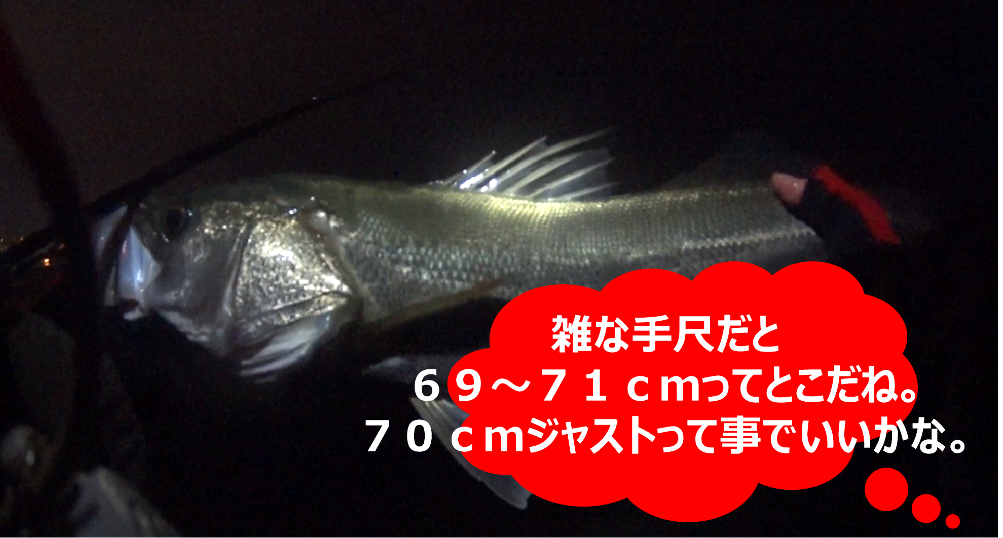 ⬛いつもの如く、雑な手尺で計測してみると、69~71cmという感じの良型シーバスだった。ただ、雑な手尺と言っても、私の場合、マメに自分の手尺や指の長さをメジャーを使って再確認しており、手尺でも誤差は大体1cm以内と思って頂いていい。