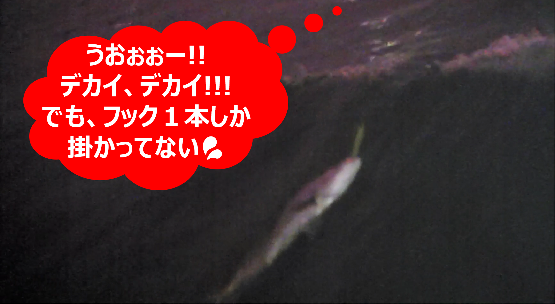 ⬛やり取りの最初は、簡単に寄ってくるので、そんなに大きなサイズだとは思わなかったが、近くに寄せてくると、突然もの凄い引きに変化。それと同時に、フックが1個外れたような感触が!