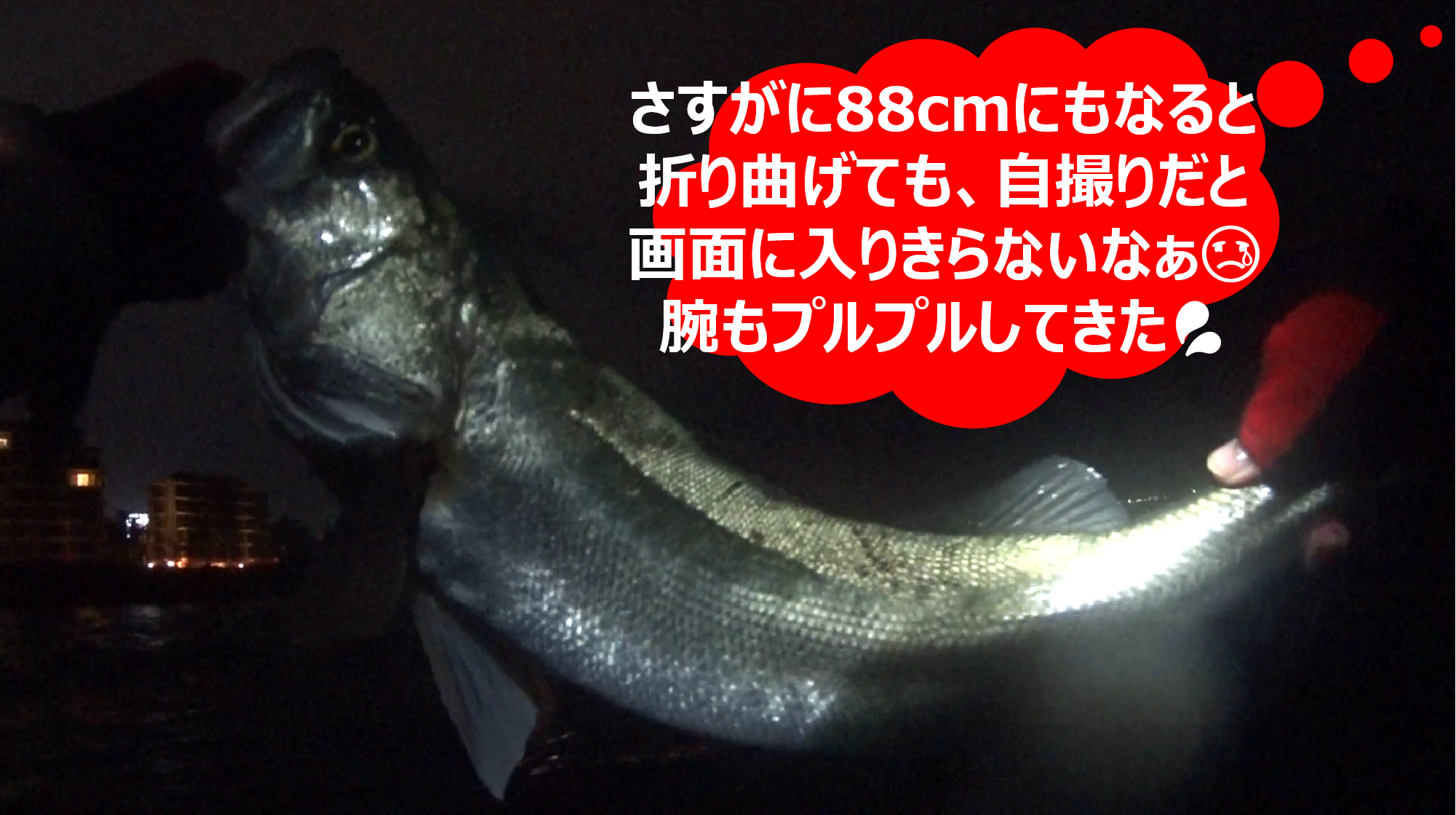 ⬛無事ランディングに成功し、サイズを確認してみると、なんと88cmのあと1歩で90cmクラスという感じのBIGランカーシーバスだった\(^o^)/