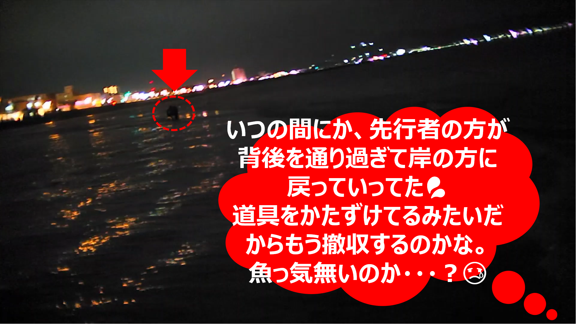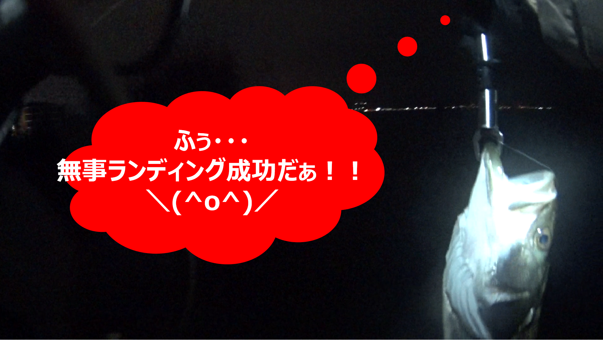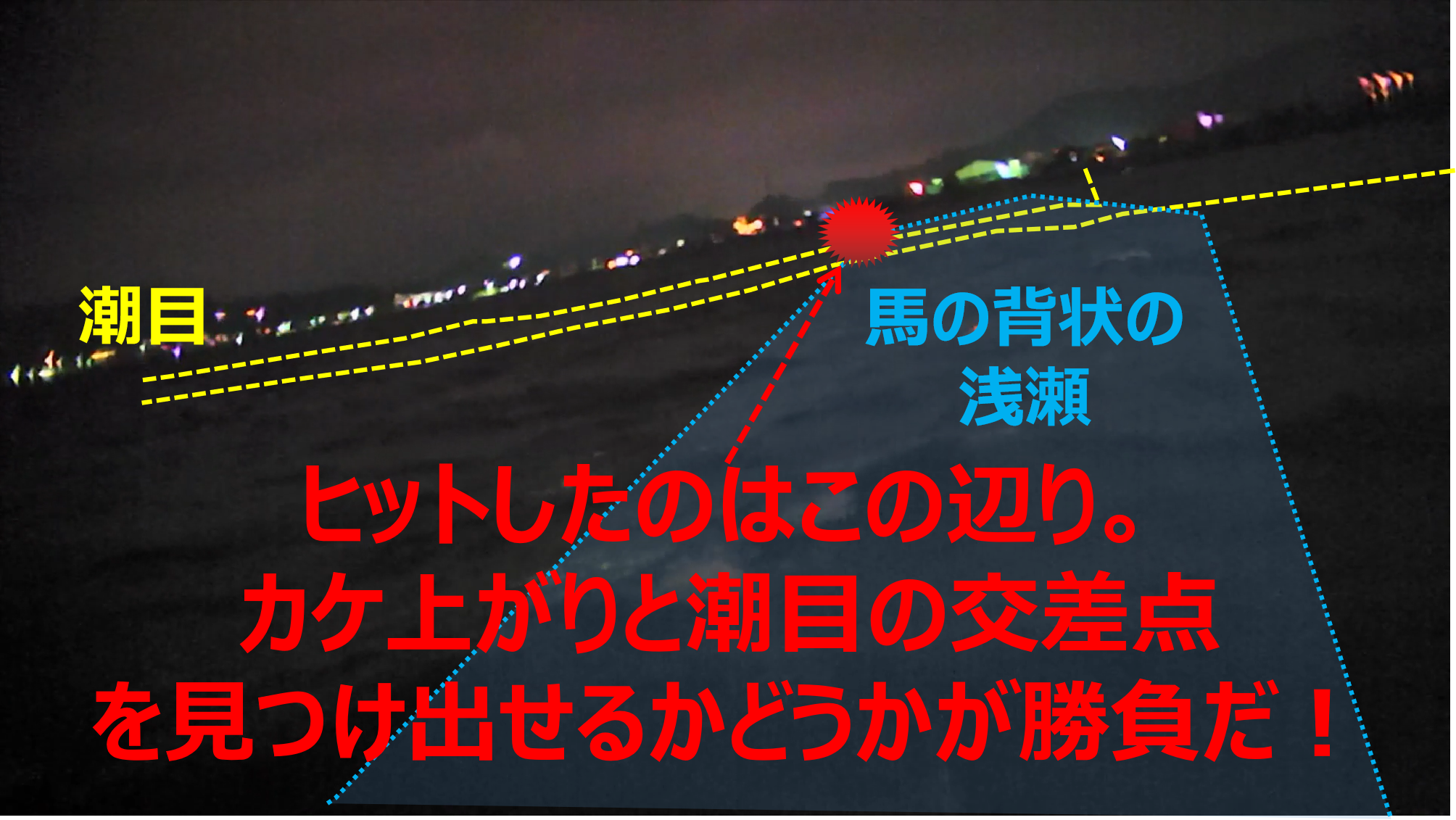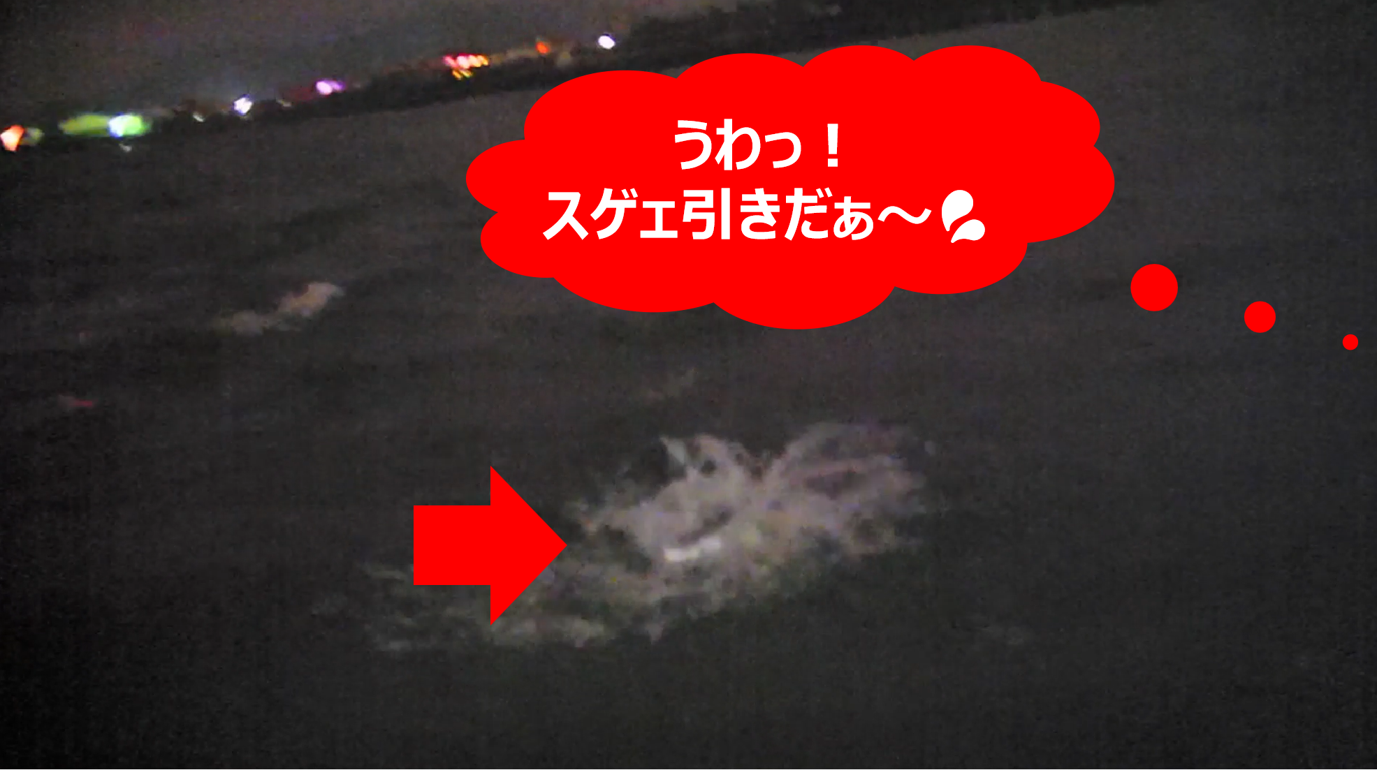 ⬛暗視ビデオカメラでやっと見えるくらいの潮目だったので「先行者の方は、あの潮目見えてなかったのかも・・・」と、淡い期待を持ちつつ、とりあえず浅瀬のカケ上がりと、潮目の交差点を狙いキャストしてみると、すぐに怪しいバイトのような感触が連発し、その直後に70cmクラスがヒット!!😮