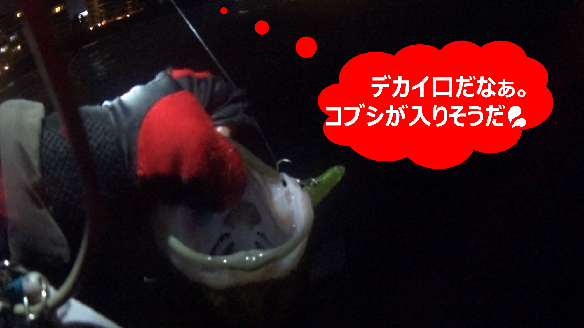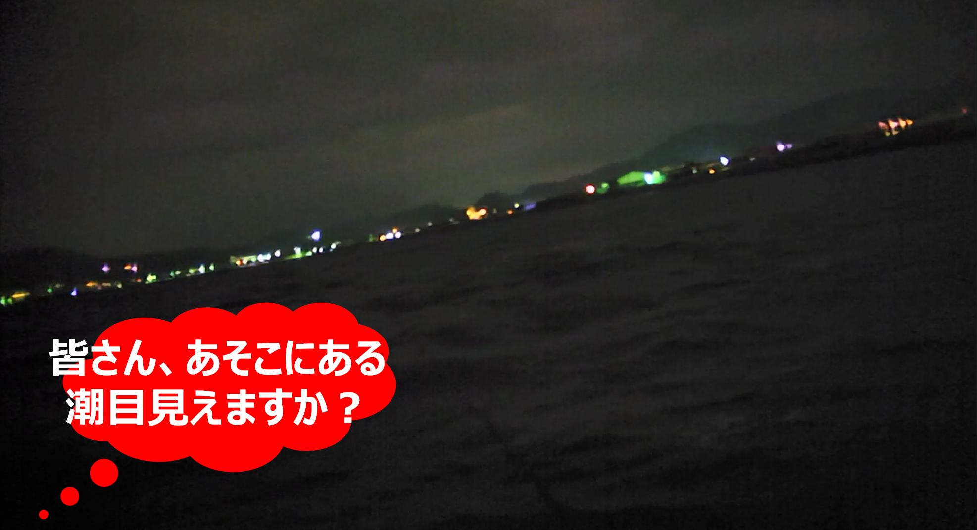 ちなみに、以下の画像は取材時にナイトビジョンカメラで撮影した動画からのキャプチャー画像なので、画像が粗く、ピントも合っていないが、一般的なアクションビデオカメラだと、真っ暗で何も映っていない画像になる(一応、一般的なアクションビデオカメラで同時撮影した動画も、最後におまけで掲載しておいた)のでご容赦を。当日の実釣時の状況については、下に掲載してあるナイトビジョンカメラの動画をご覧頂いた方が、よく見えると思う。