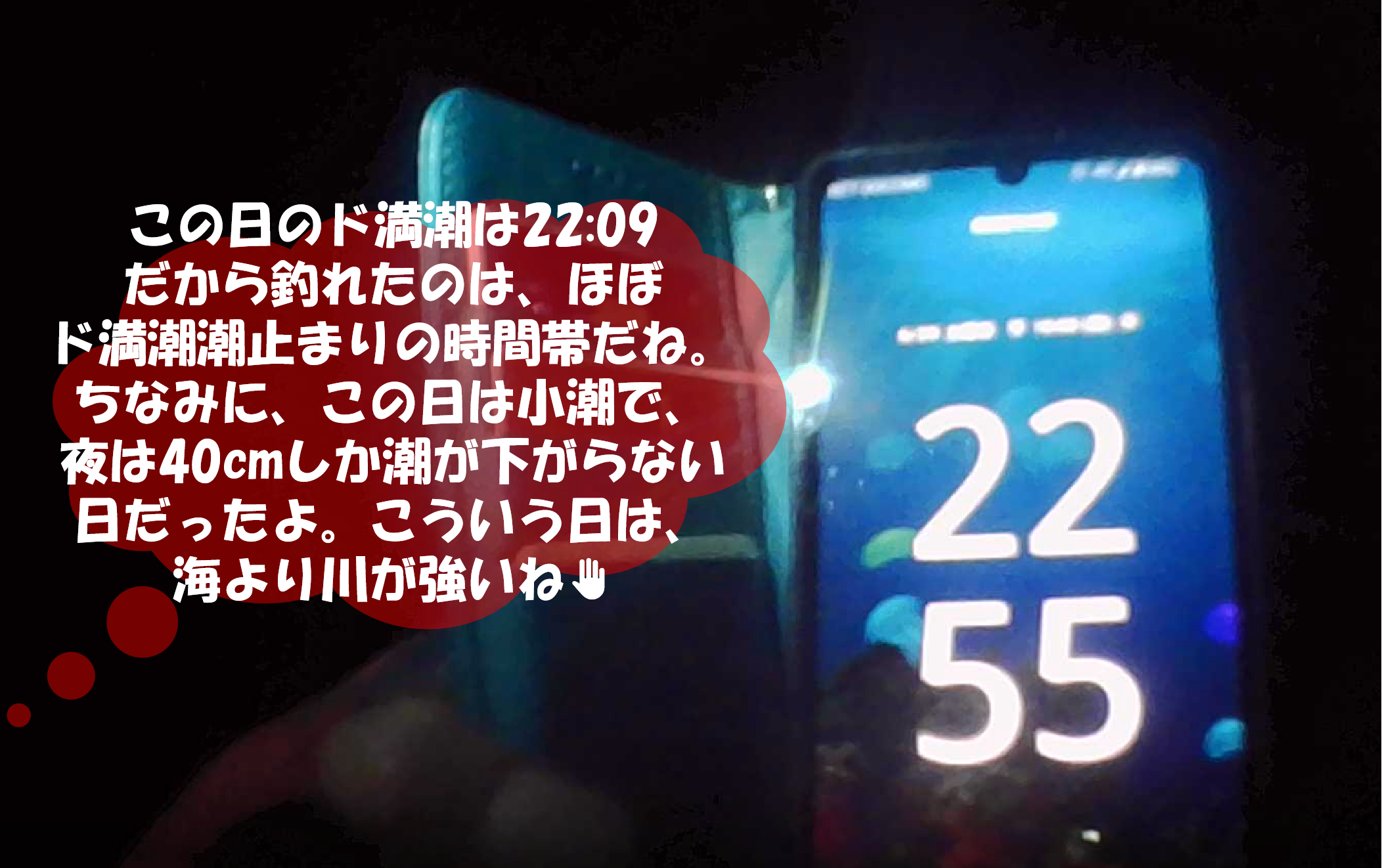 ちなみに、Bigシーバスがヒットしたのは「22時40~50分くらい」の時間で、ほぼド満潮潮止まりのタイミングだった。小潮で、潮止まりの時間にしか釣りが出来なかったこの日は「海系」のポイントでは、おそらく苦戦していただろう。