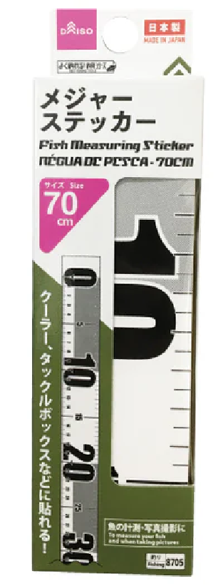 これは、私のようにホームページやSNSで情報発信するような人間にとっては、長年の悩み事でもあった。そんな中、これまたダイソー(DAISO)をブラブラ探索していたら、シールタイプのメジャーを発見したので、コレをロッドに貼り付けておけば、ロッドに沿って魚をぶら下げれば、ウェーディング中でも魚を計測出来るのでは無いかと思い、それを試してみる事にしたのだった。