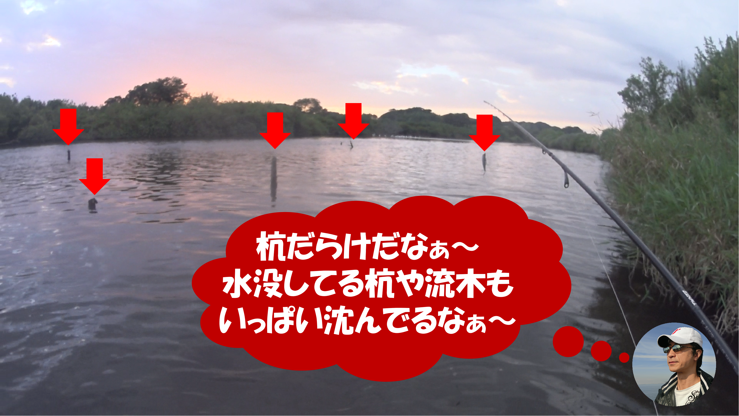 下の画像がこのポイントの雰囲気なのだが、このポイントの最大の特徴は「杭」がやたら多いという点だ。で、1本や2本くらいの杭なら、ウナギ狙いの仕掛けの杭である事も多いのだが、ここではあるラインの周辺に杭が多数入って居る。