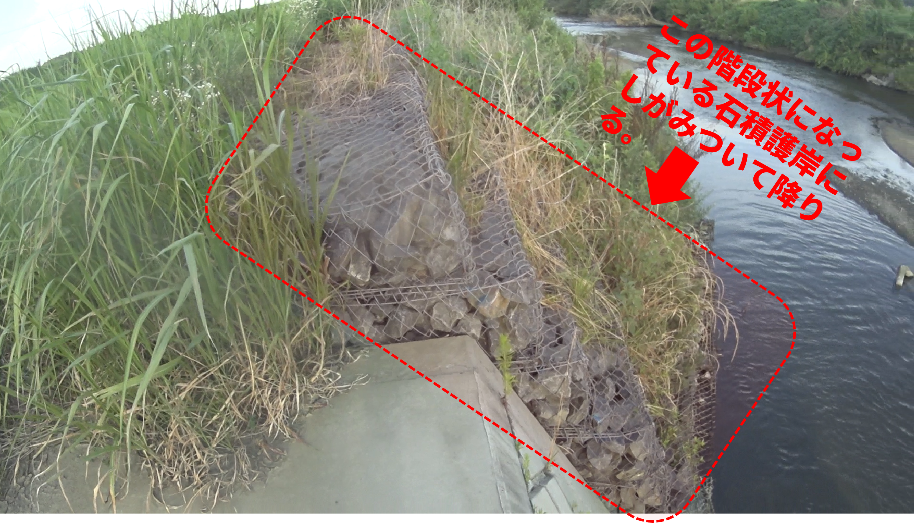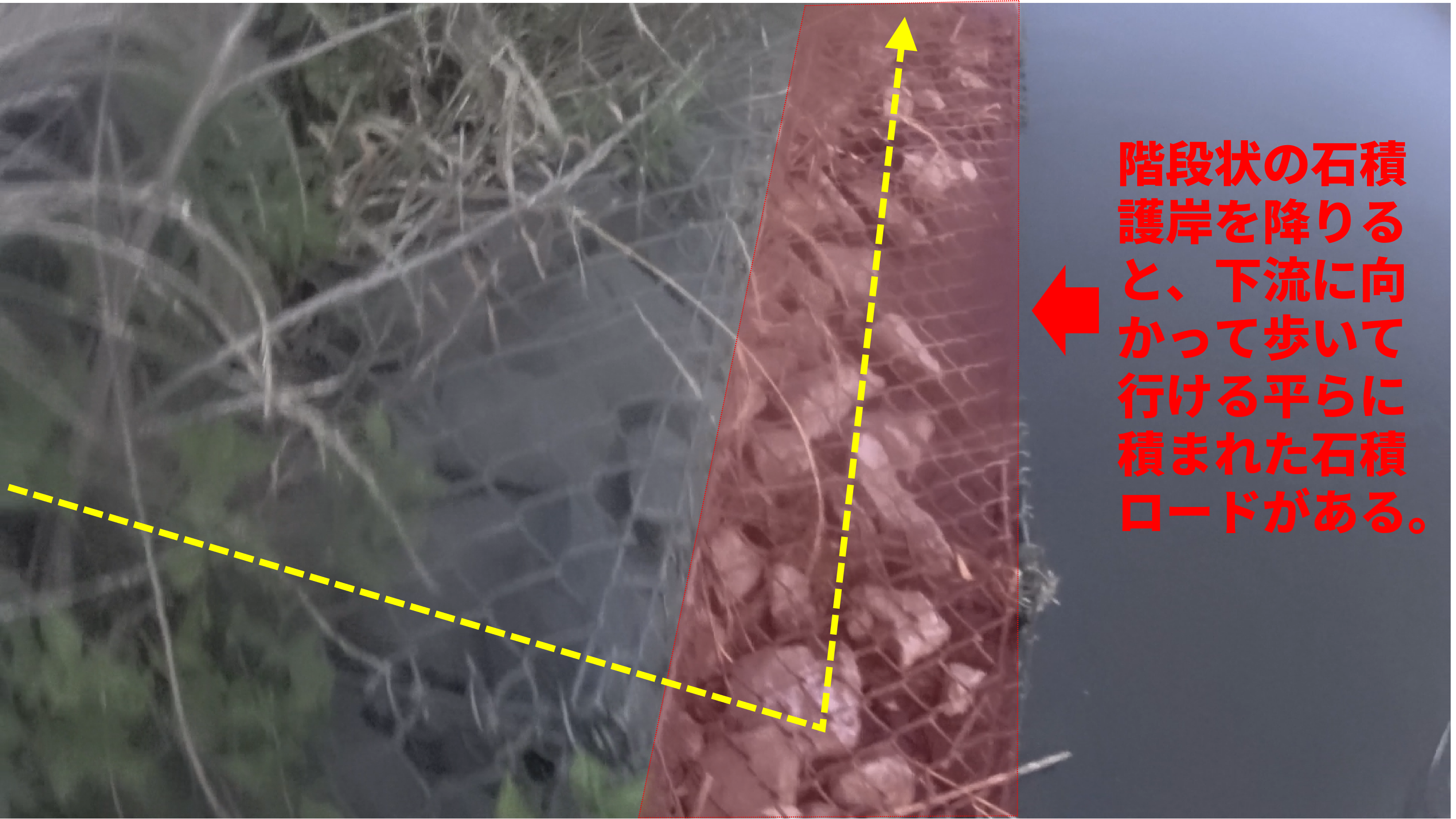 ヒントとしては下の画像にある石積み護岸にへばりついて川面に降り立って、河川内のまぁまぁな距離をウェーディングしてゆくと辿り着けるポイントだ。